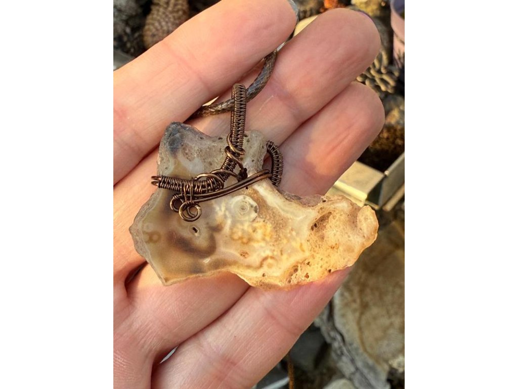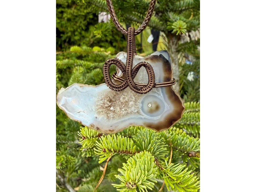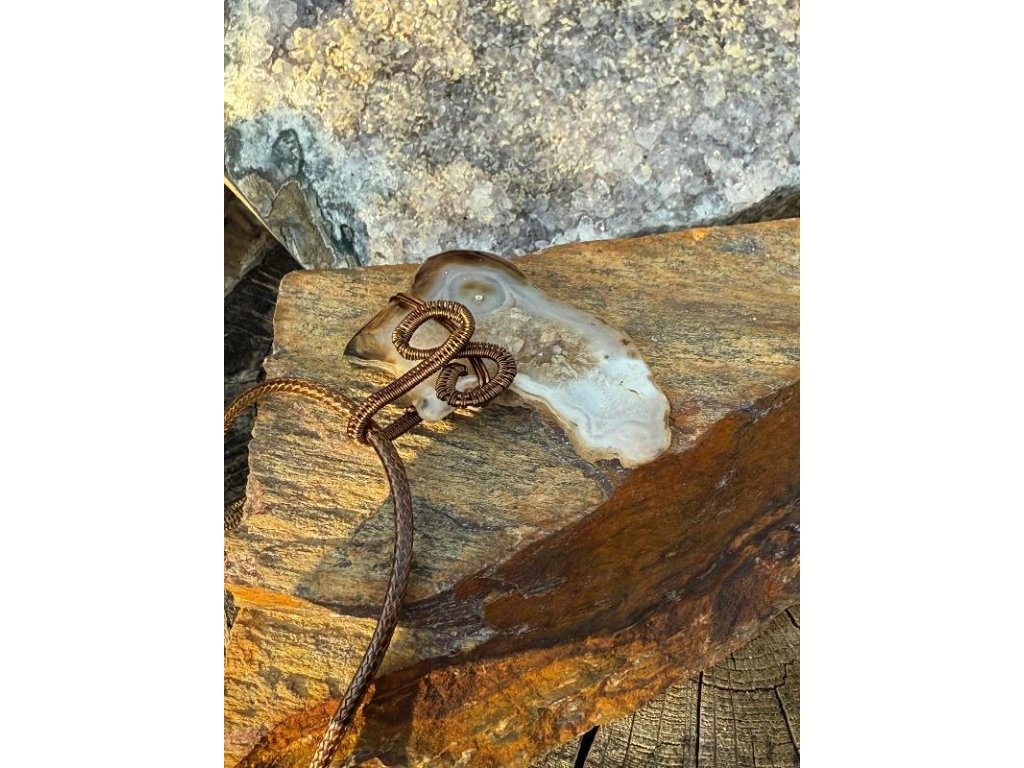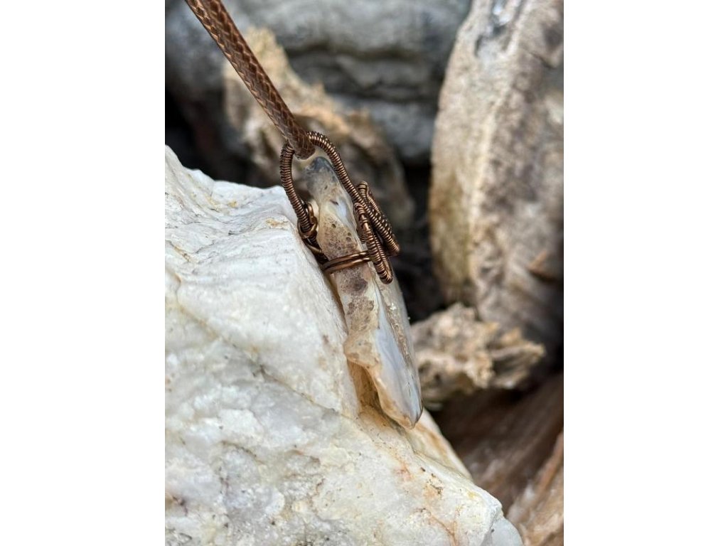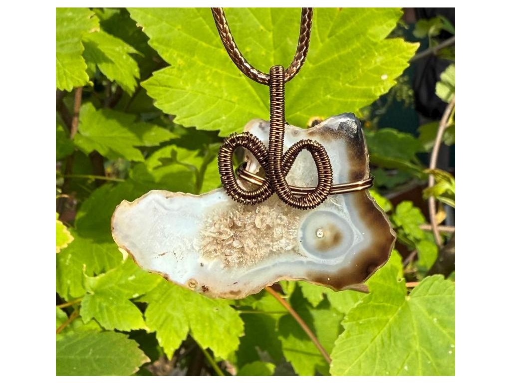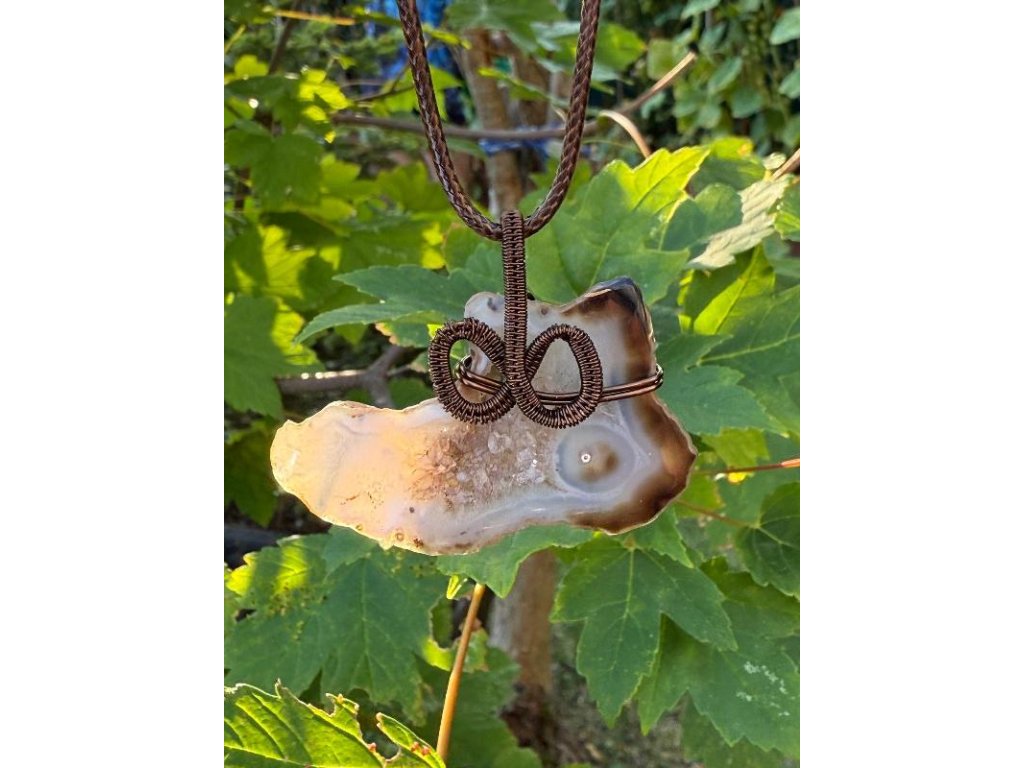 Na tento šperk je použitá achátová drúza ve tvaru boty o rozměrech 4,85 × 3,21 cm. Použité drátky jsou z lakované mědi v barvě páleného dřeva.