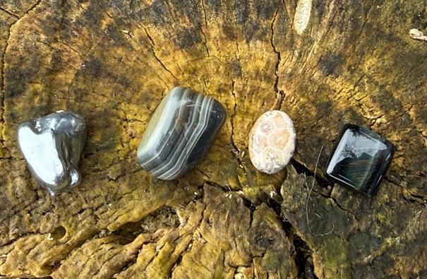Tentokrát jsme vybíraly s Ivčou čtyři kamínky: černou perleť, černý opál, fosílii a sokolí oko.