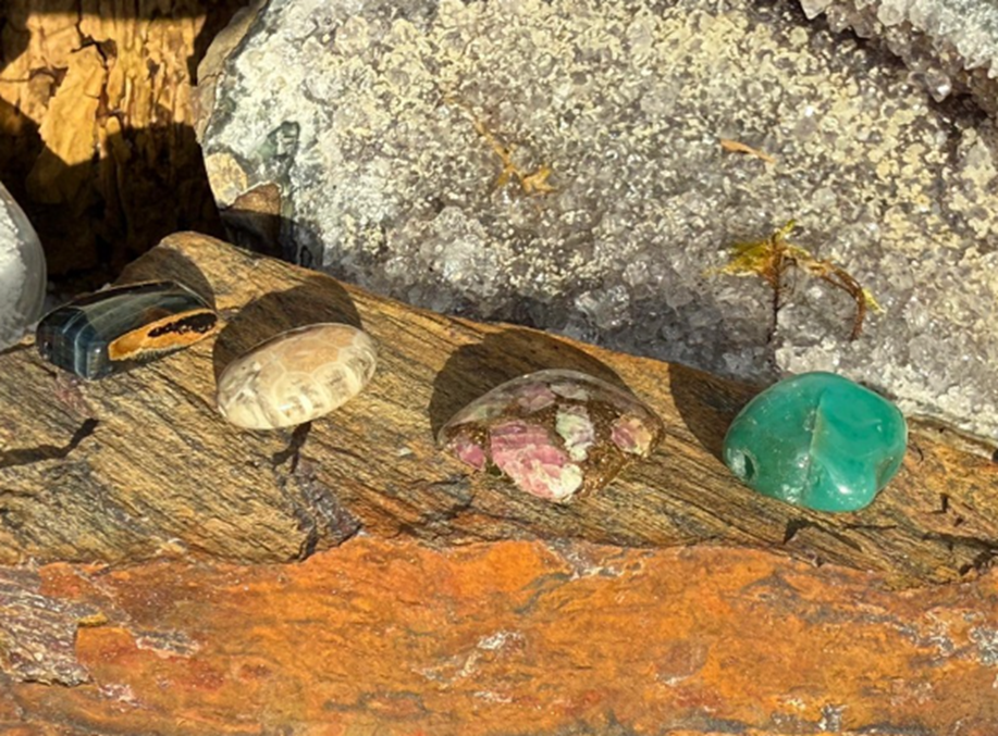 Tentokrát jsme vybíraly s Ivčou čtyři kamínky: sokolí oko, fosílii, složený kamínek z rubelitu (růžový turmalín) a achátový korálek.