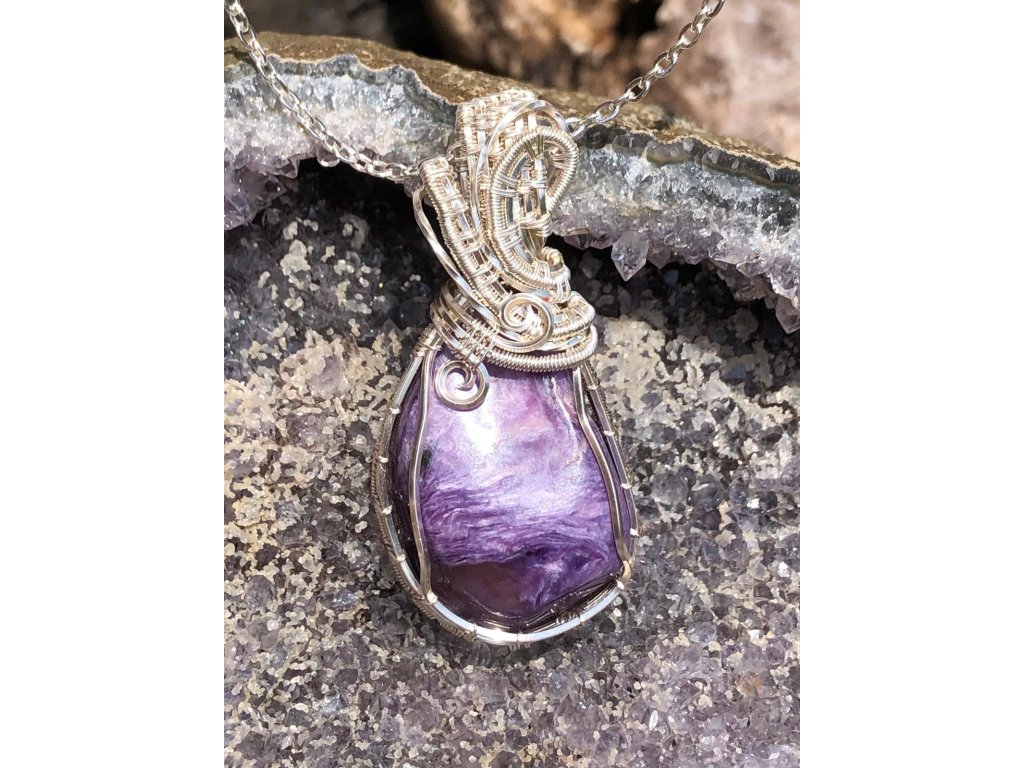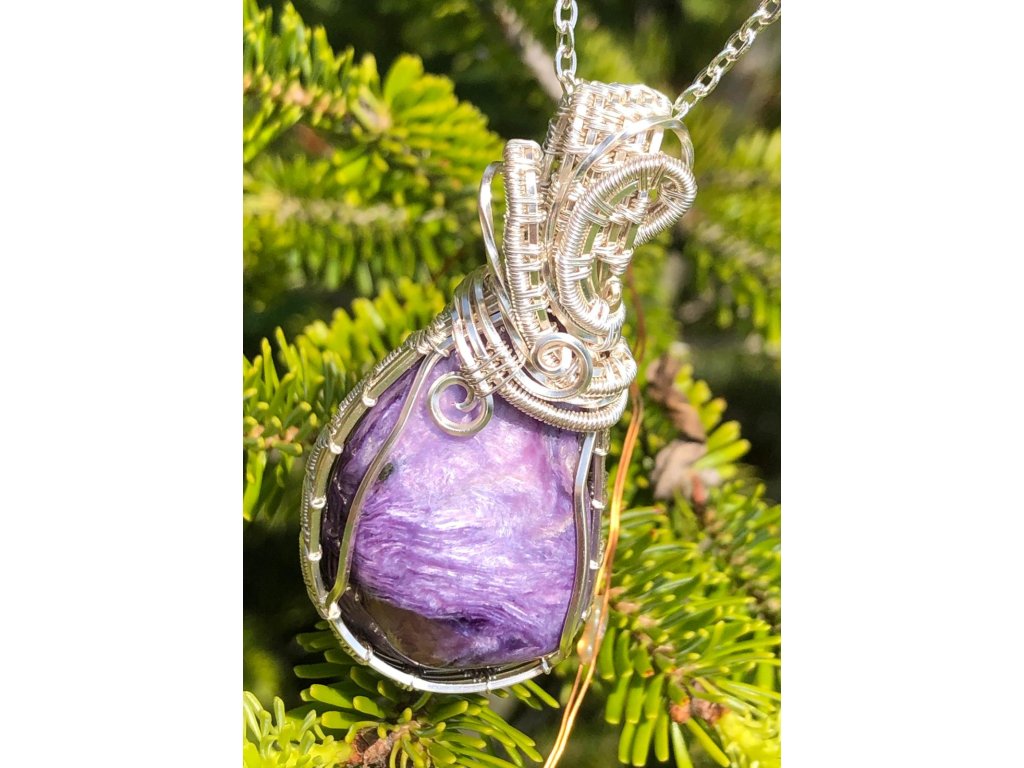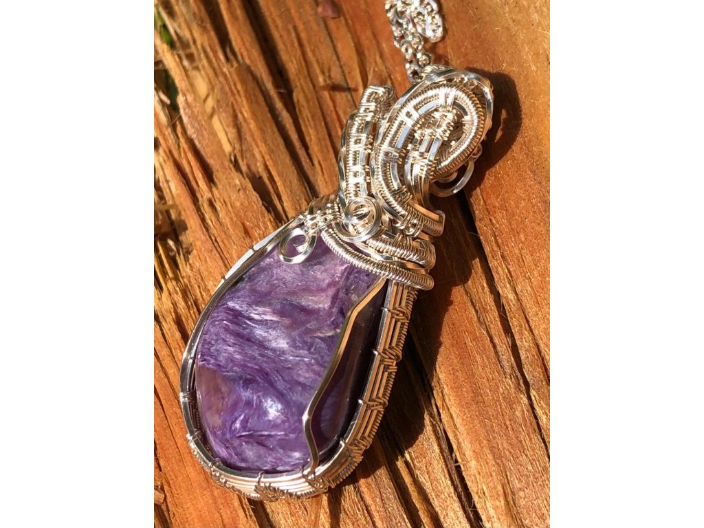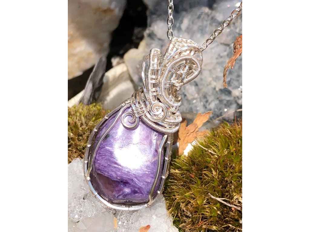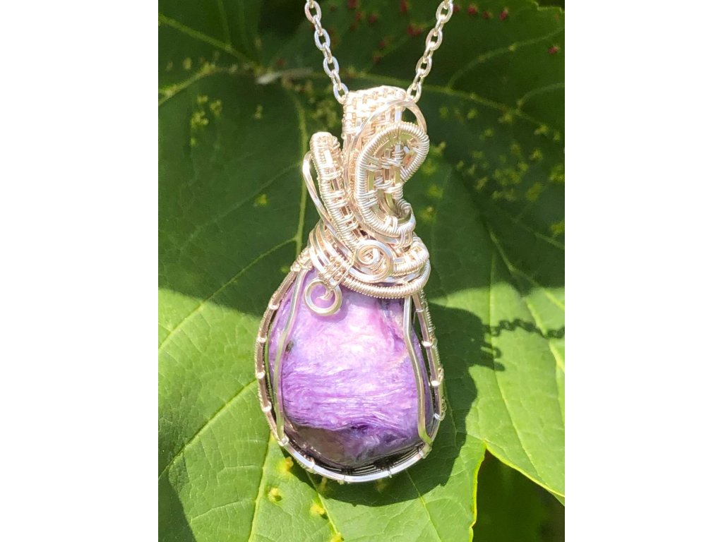 Na tento náhrdelník s čaroitem je použitý tromlovaný kámen, který pochází ze Sibiře. Použité drátky jsou z lakované mědi ve stříbrné barvě.