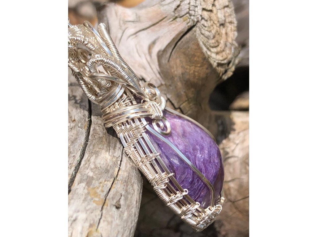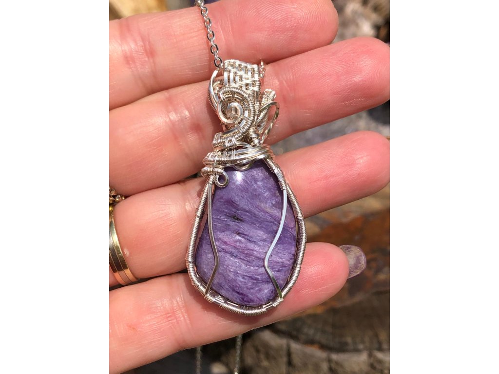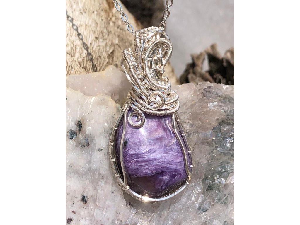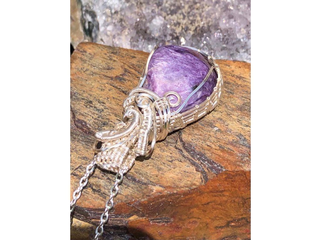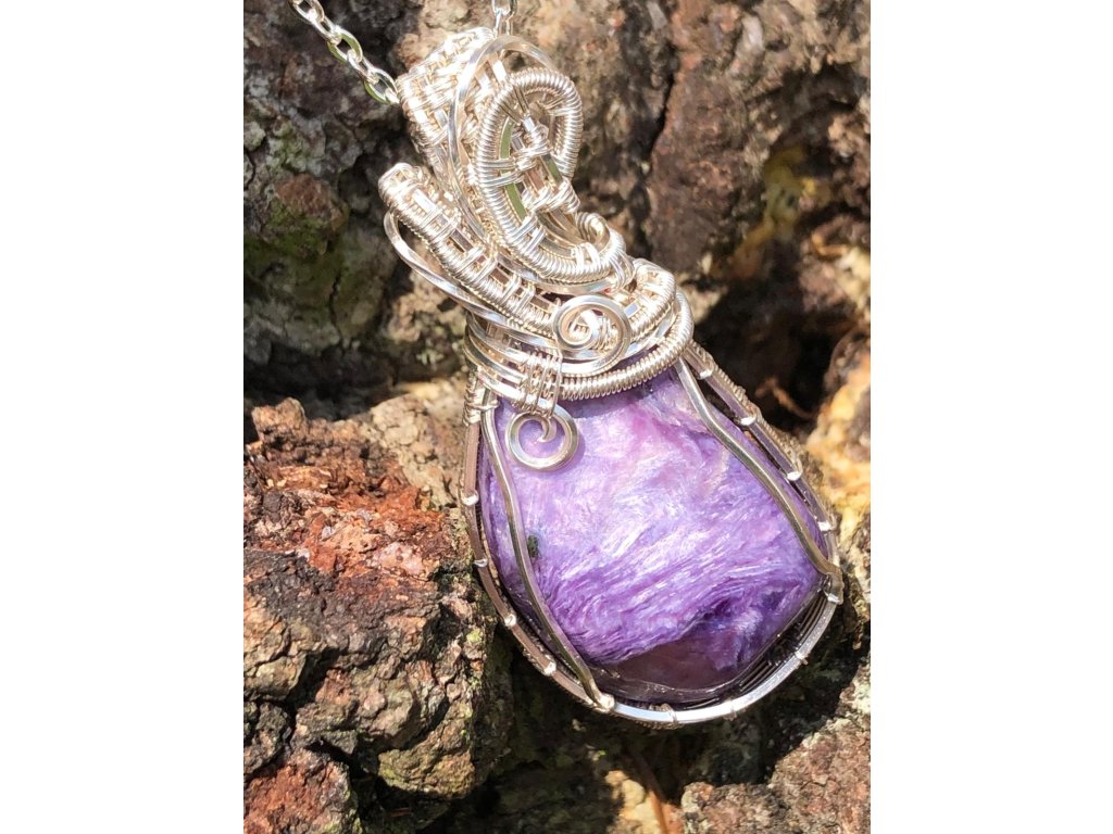 Na tento náhrdelník s čaroitem je použitý tromlovaný kámen, který pochází ze Sibiře. Použité drátky jsou z lakované mědi ve stříbrné barvě.