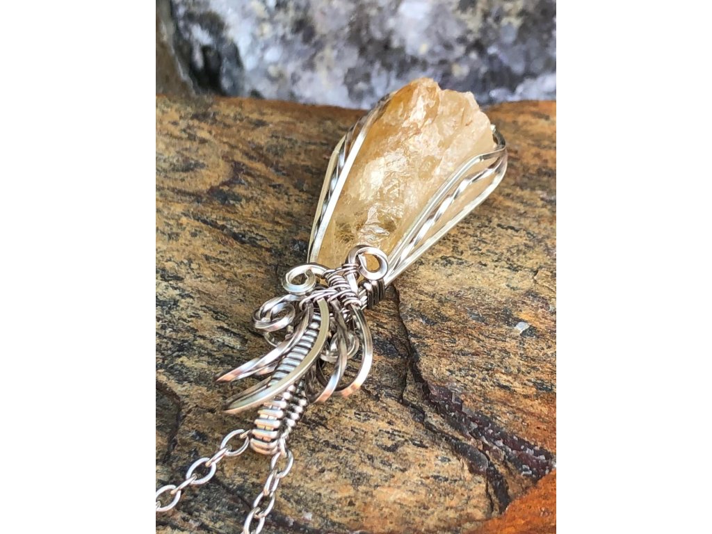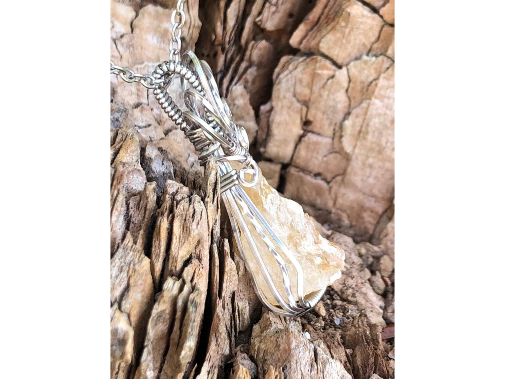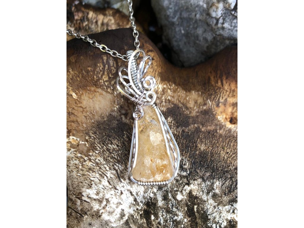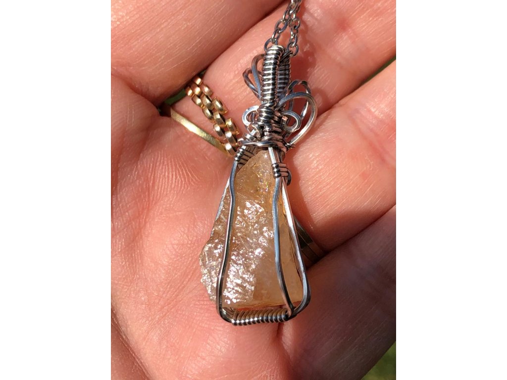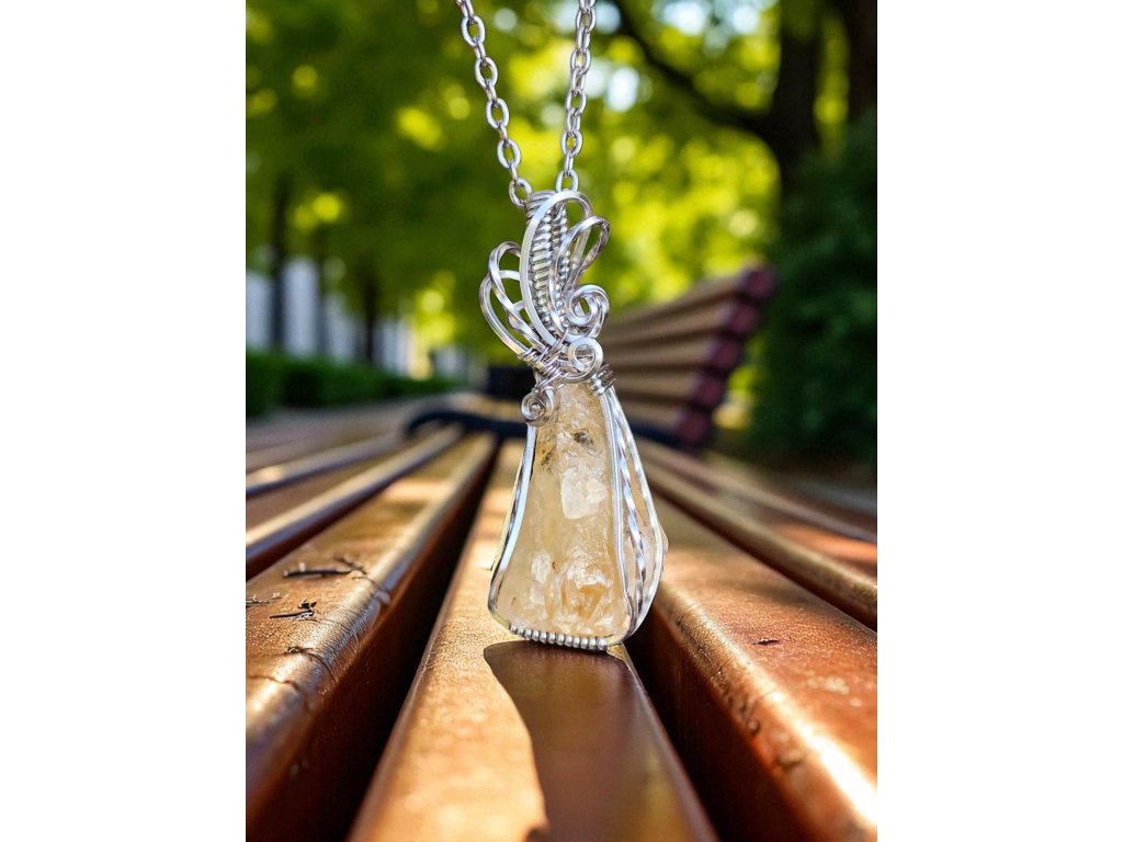 Surový kámen použitý v tomto šperku je o rozměrech 2,4 x 1,3 cm. Použité drátky jsou z lakované mědi v titanové barvě.