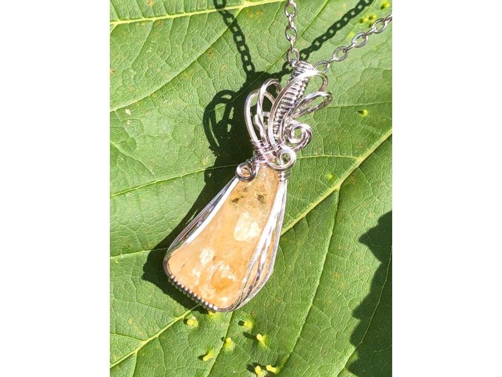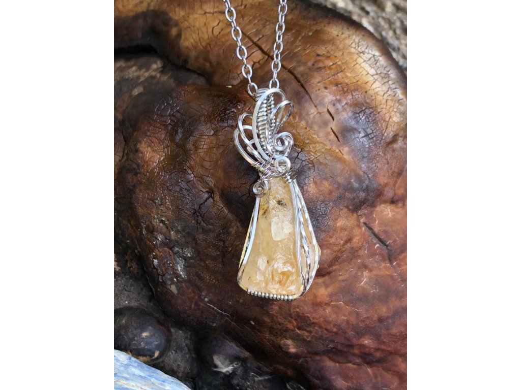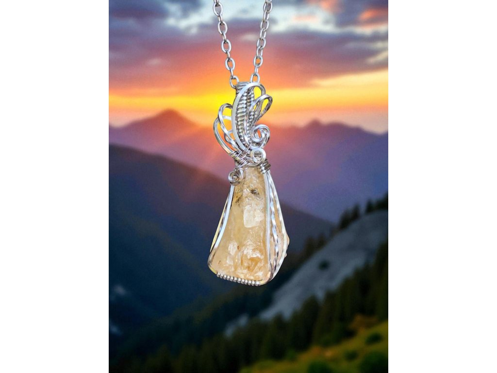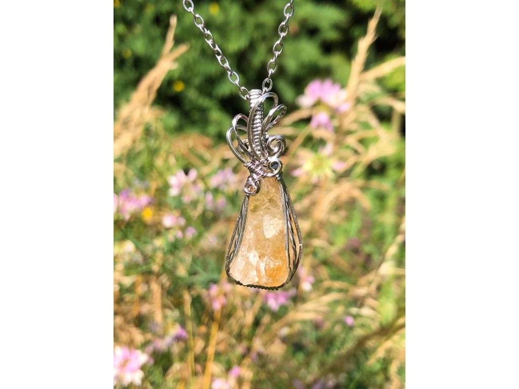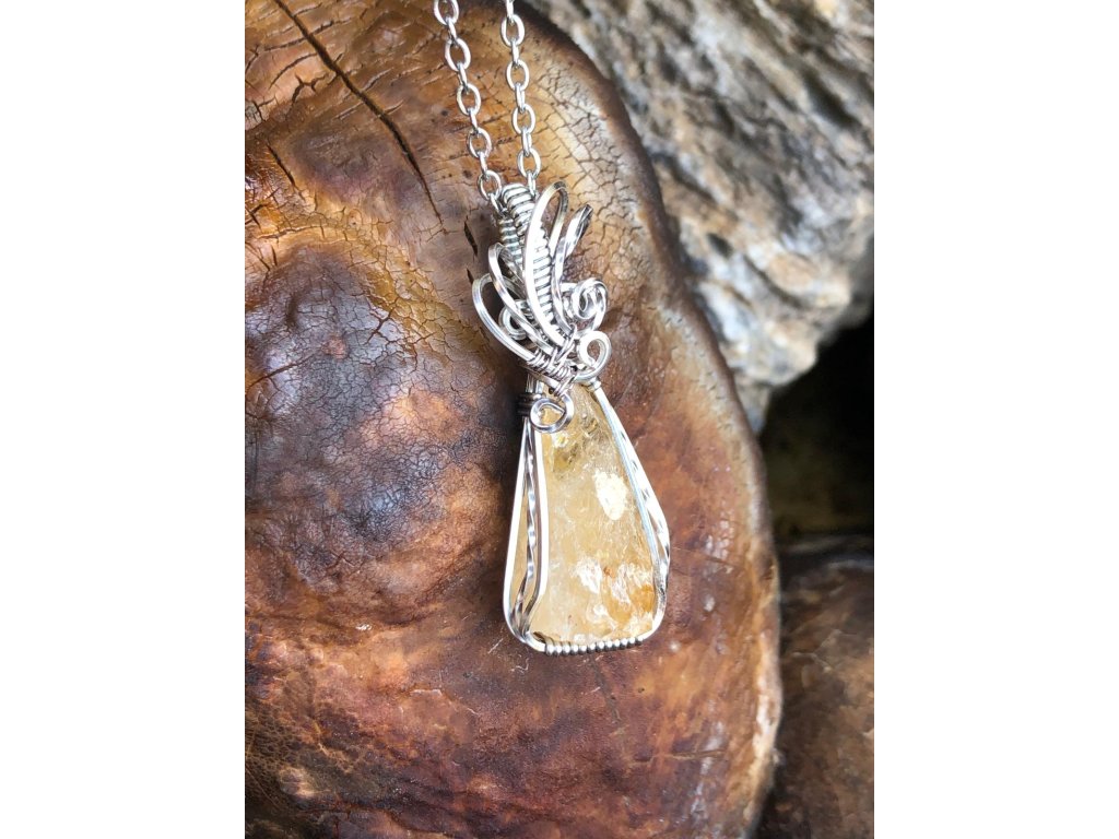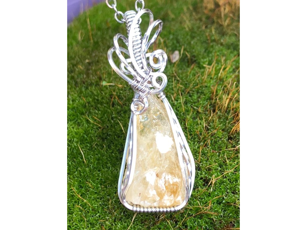 Surový kámen použitý v tomto šperku je o rozměrech 2,4 x 1,3 cm. Použité drátky jsou z lakované mědi v titanové barvě.