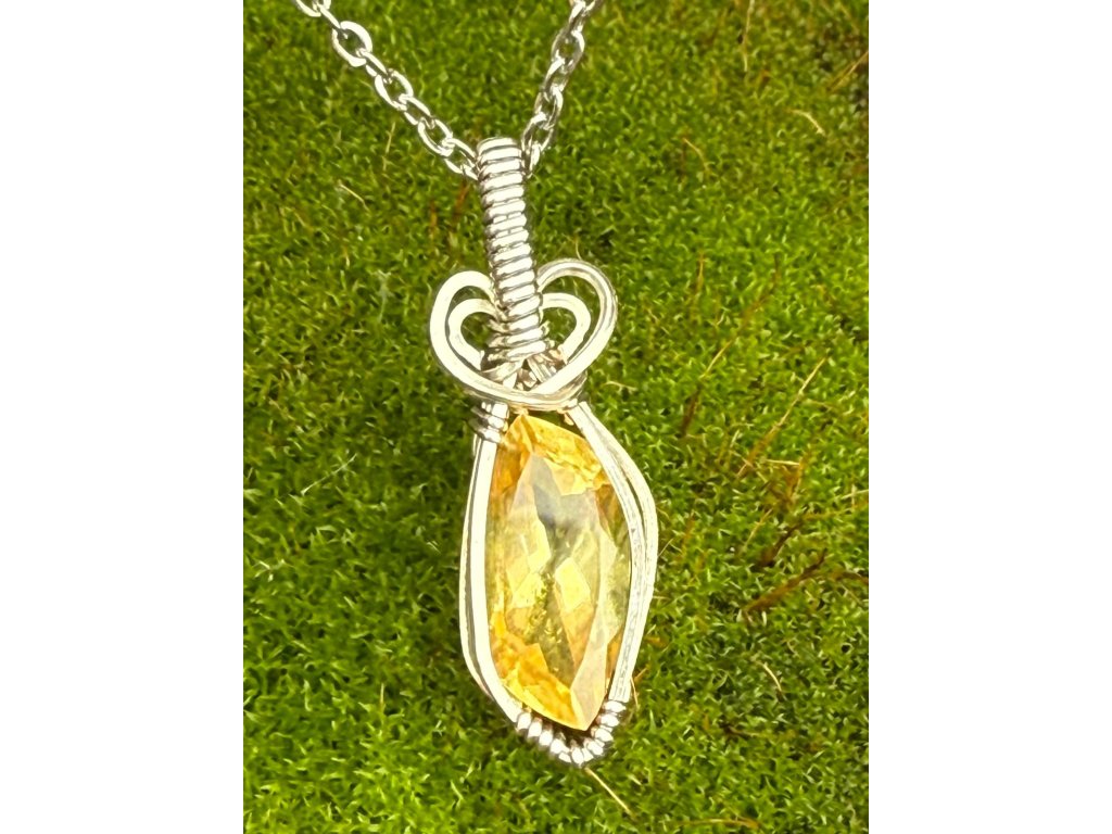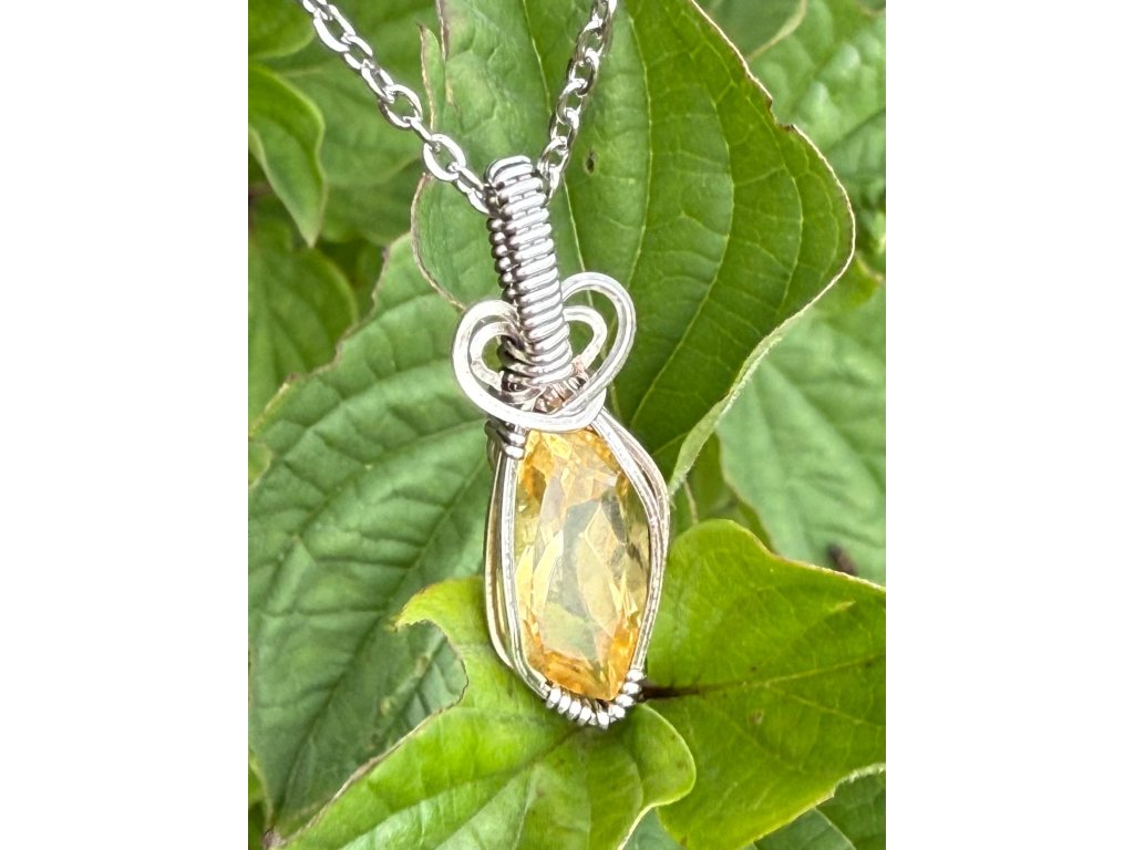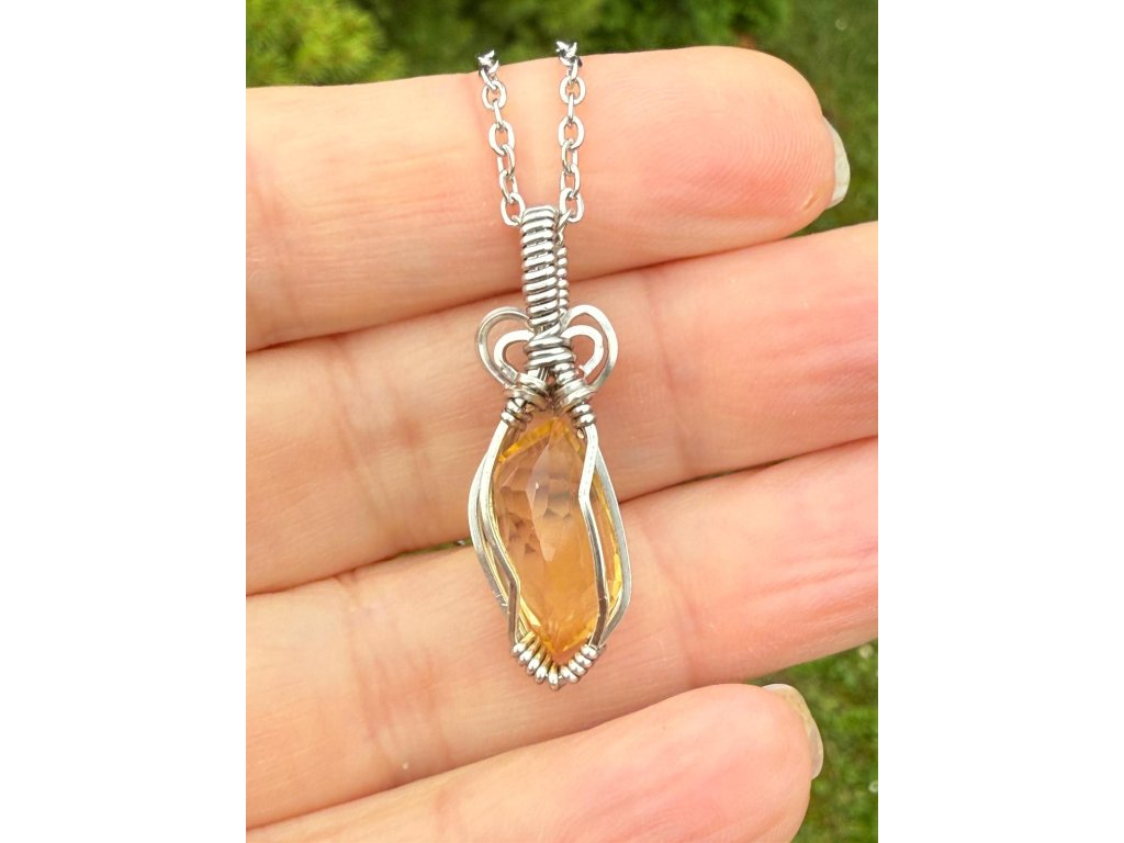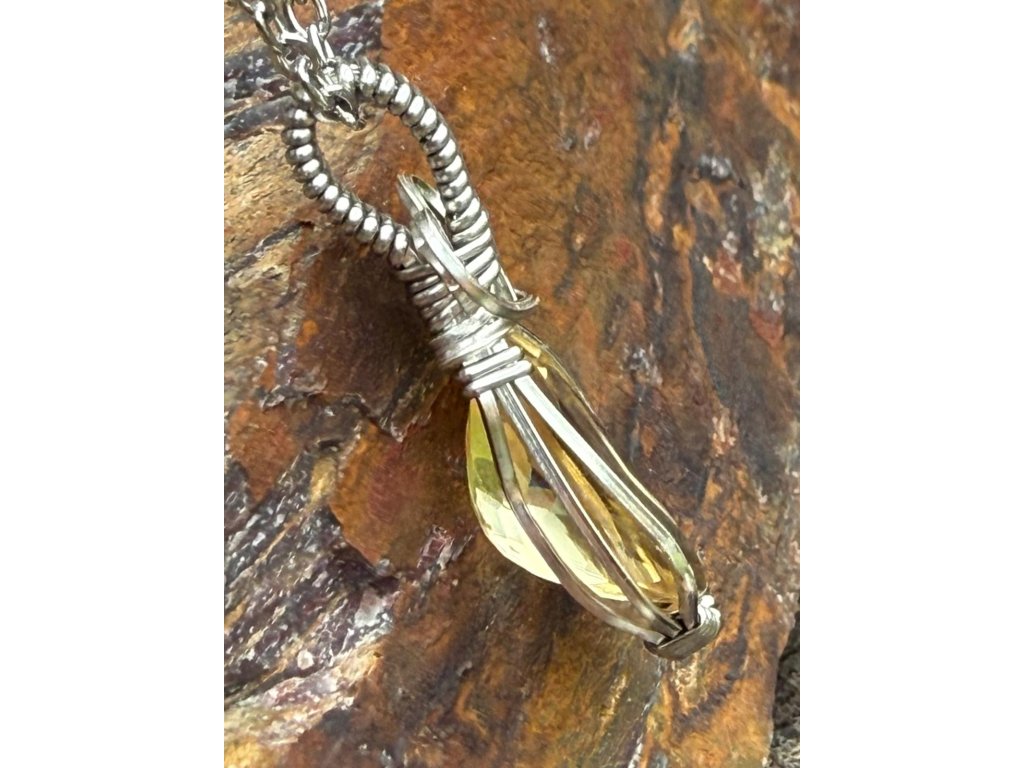 Pro tento šperk jsem zvolila broušený fasetovaný kámen. Použité drátky jsou z lakované mědi v titanové barvě.