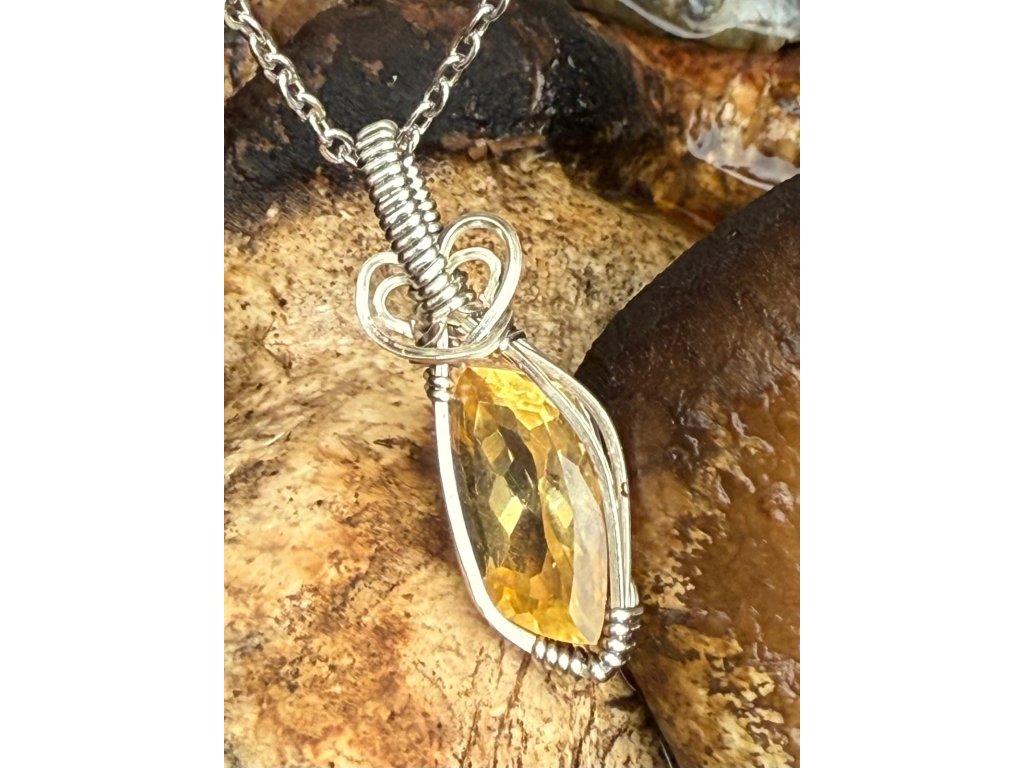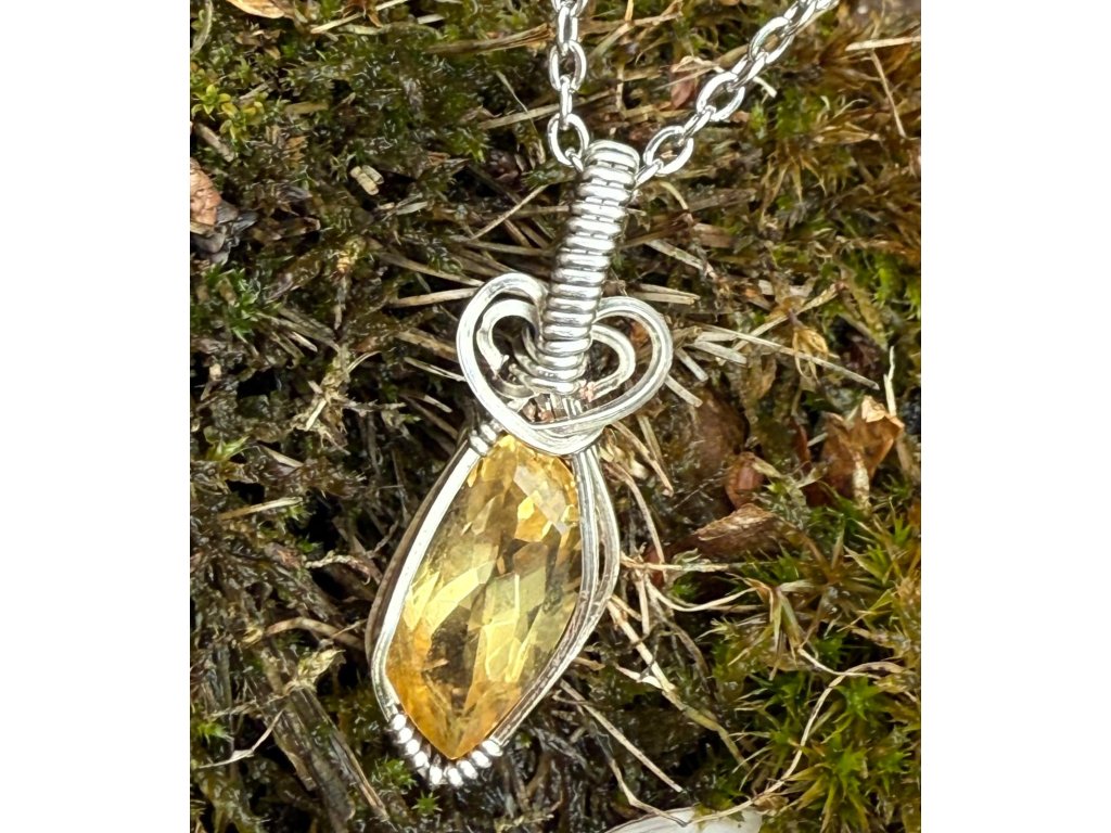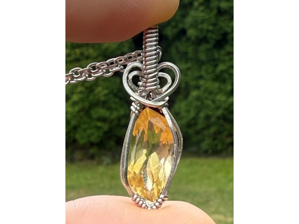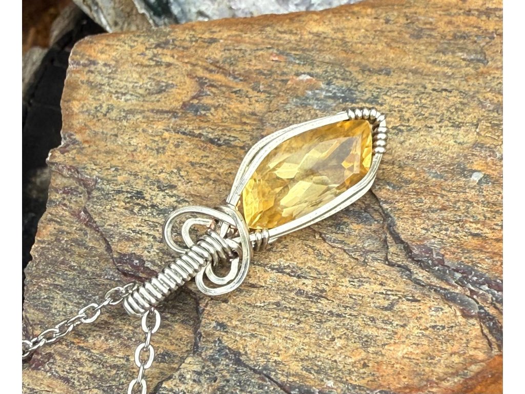 Pro tento šperk jsem zvolila broušený fasetovaný kámen. Použité drátky jsou z lakované mědi v titanové barvě.