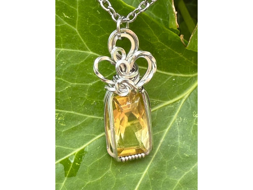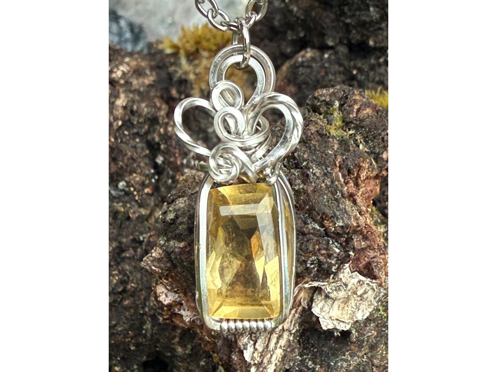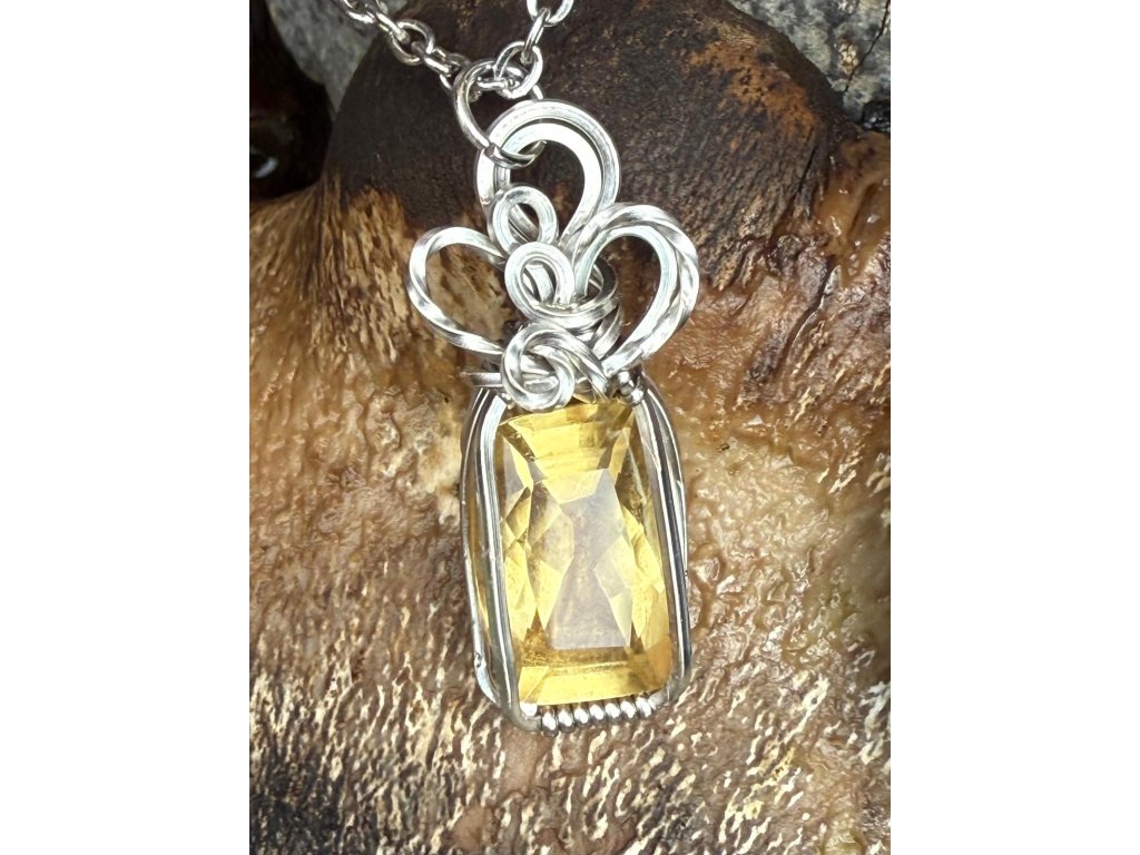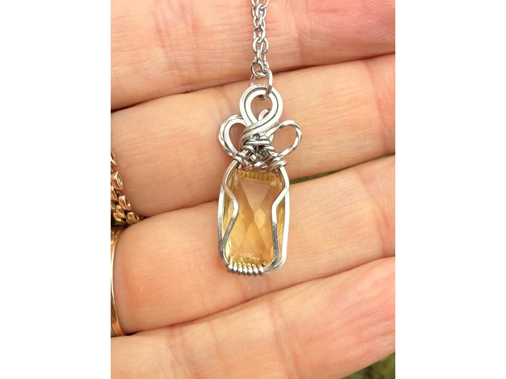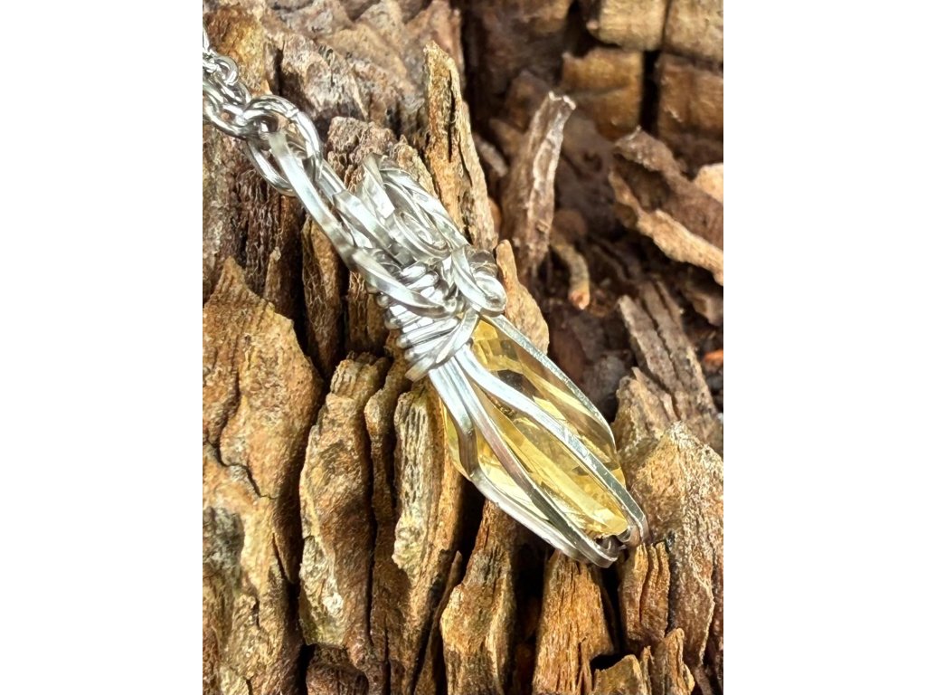 Do šperku jsem použila broušený fasetovaný kámen menší velikosti. Použité drátky jsou z lakované mědi v titanové barvě.