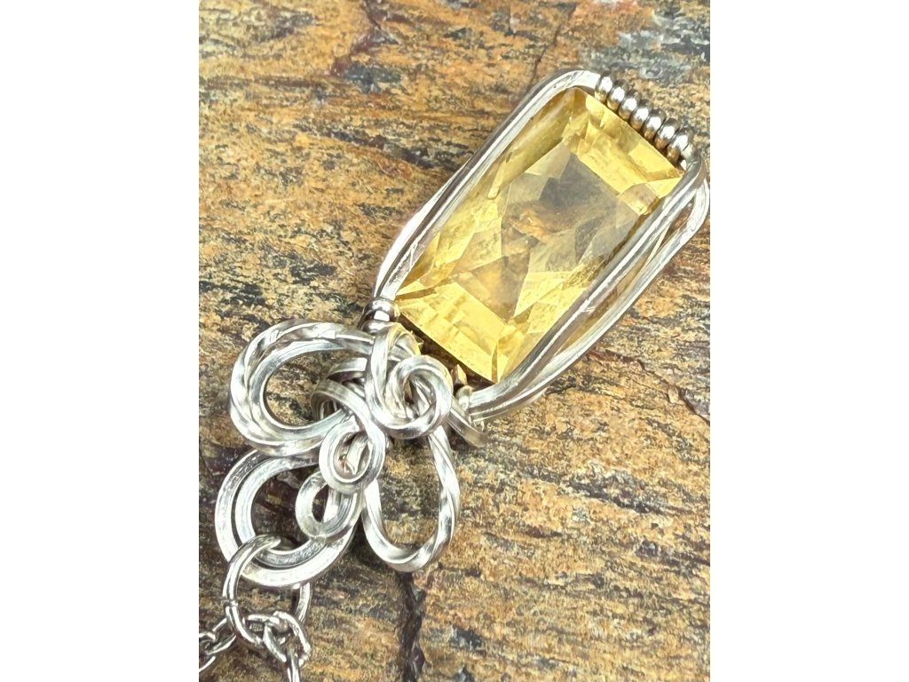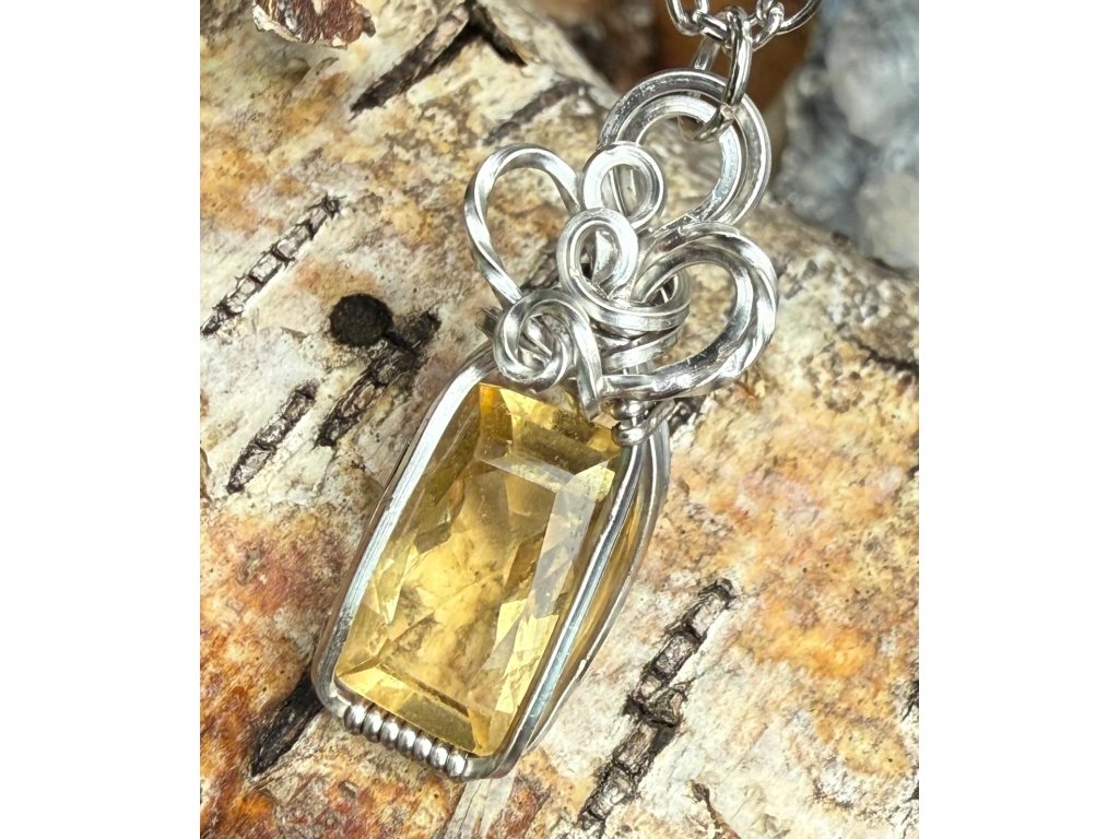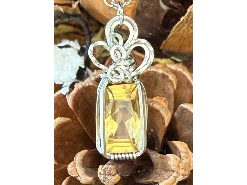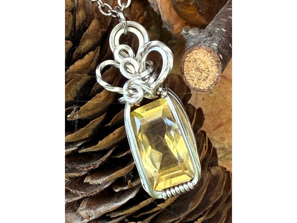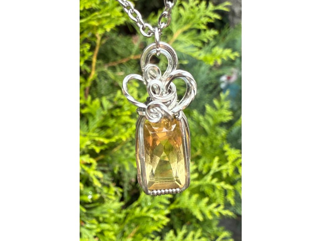 Do šperku jsem použila broušený fasetovaný kámen menší velikosti. Použité drátky jsou z lakované mědi v titanové barvě.