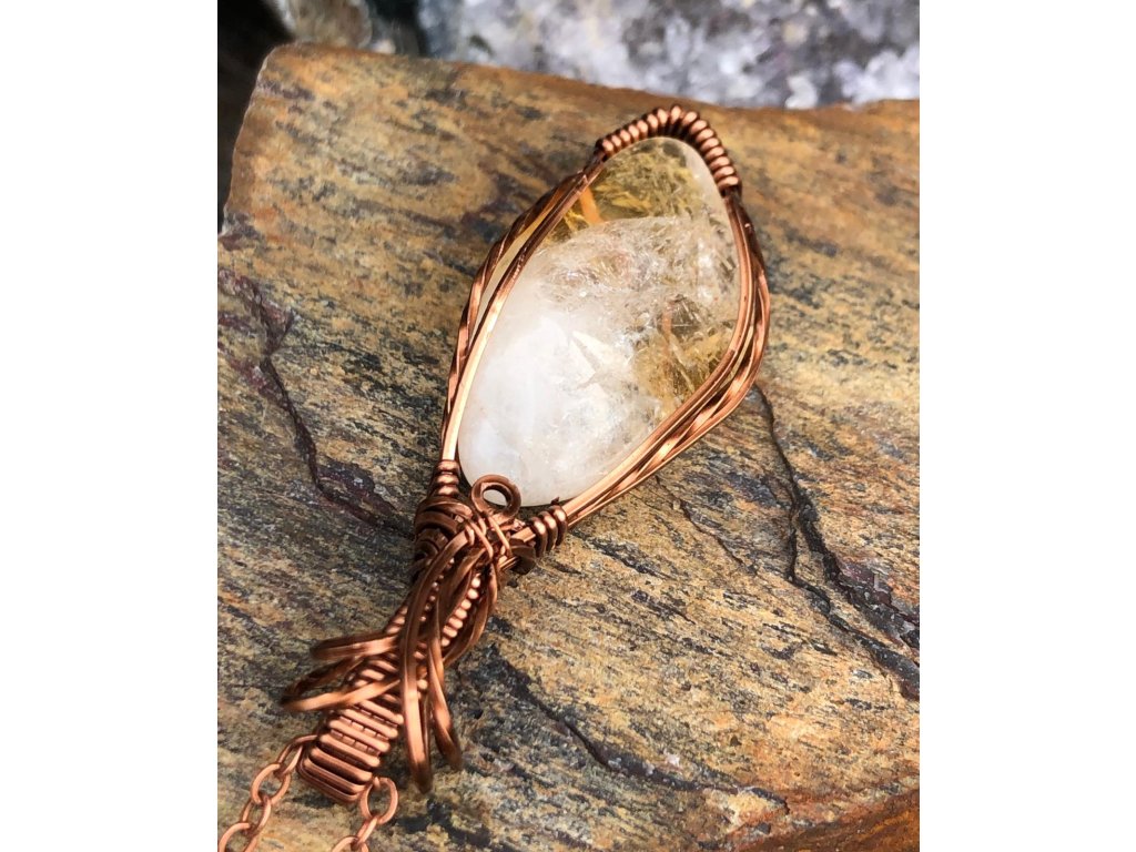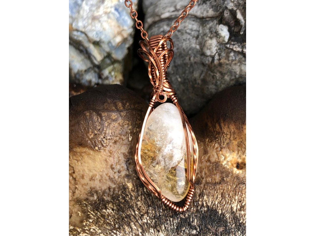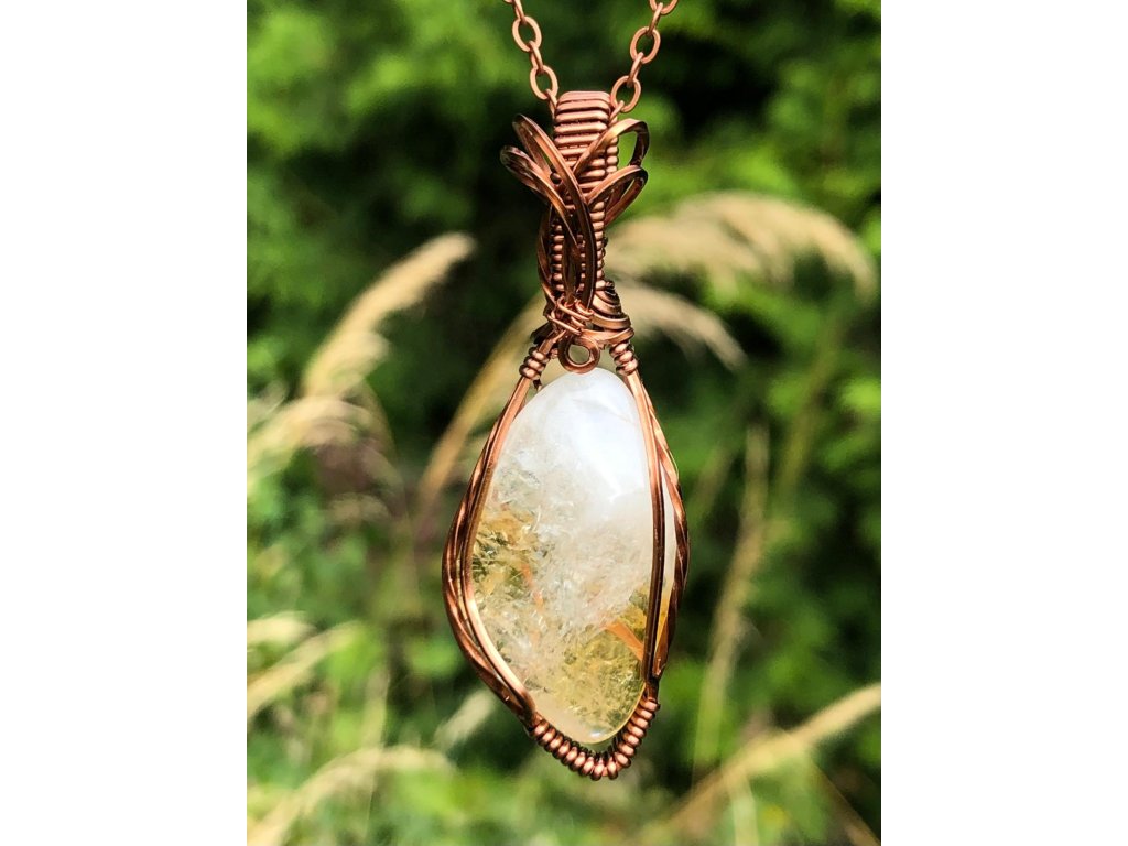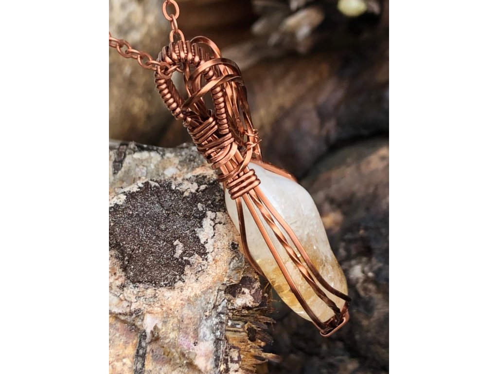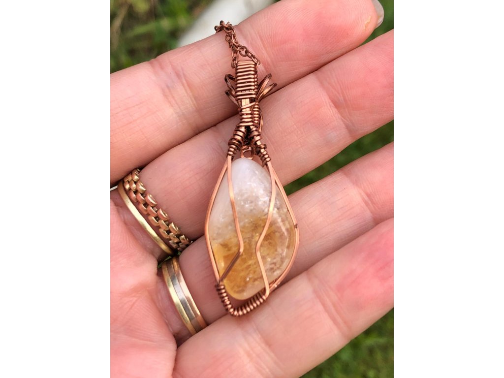 Na tento šperk jsem použila tromlovaný valounke o rozměrech 2,8 x 1,7. Použité drátky jsou z lakované mědi v barvě antické mědi.