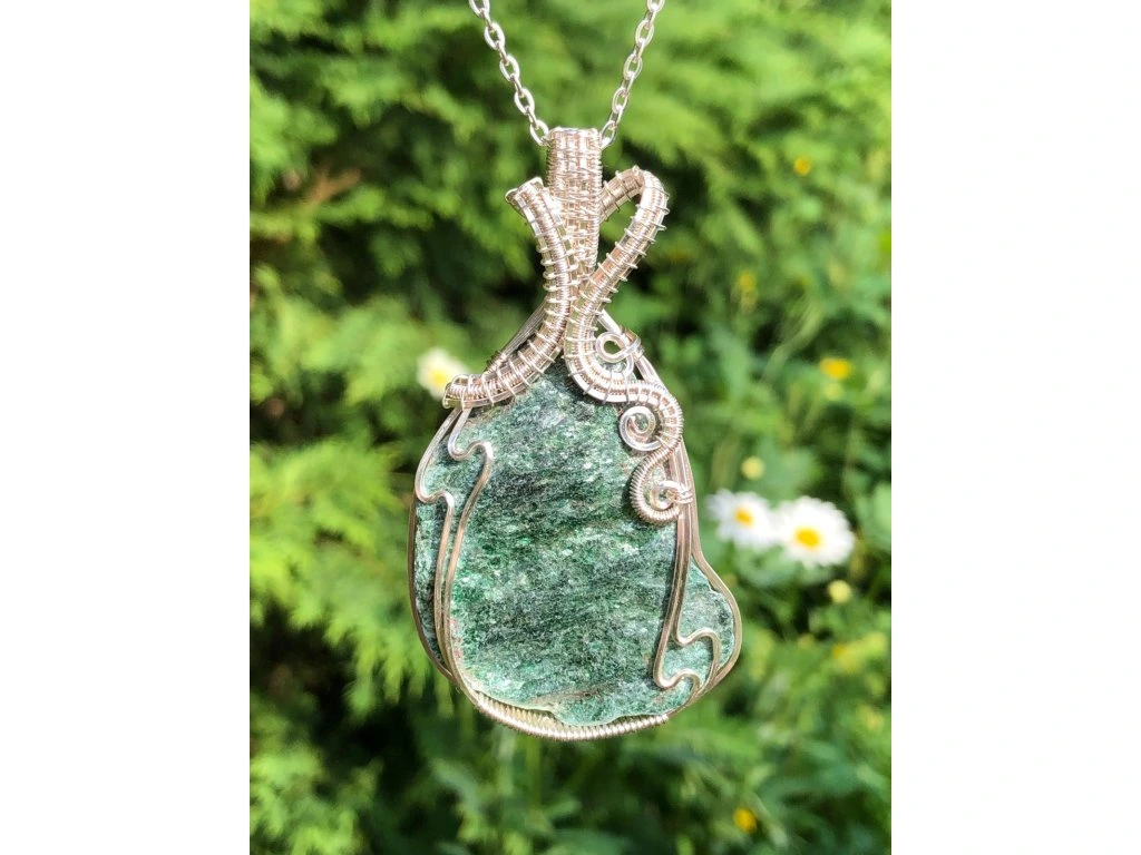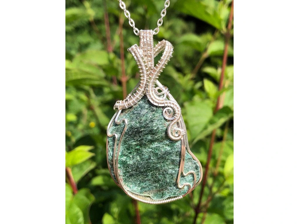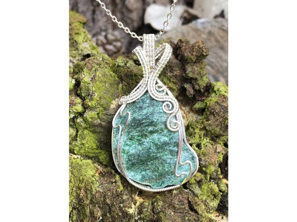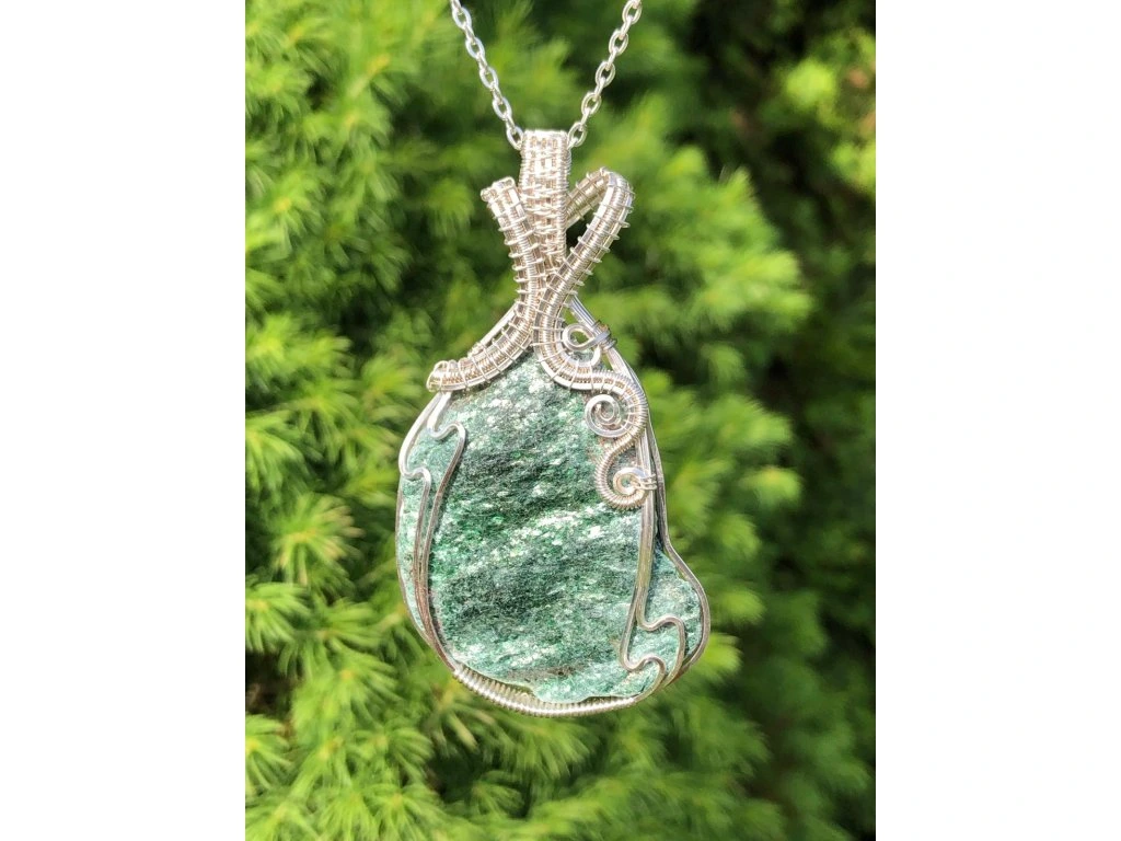 Jedinečný surový minerál fuchsitu, který je pečlivě zasazený do náhrdelníku. Použité drátky jsou z lakované mědi ve stříbrné barvě.