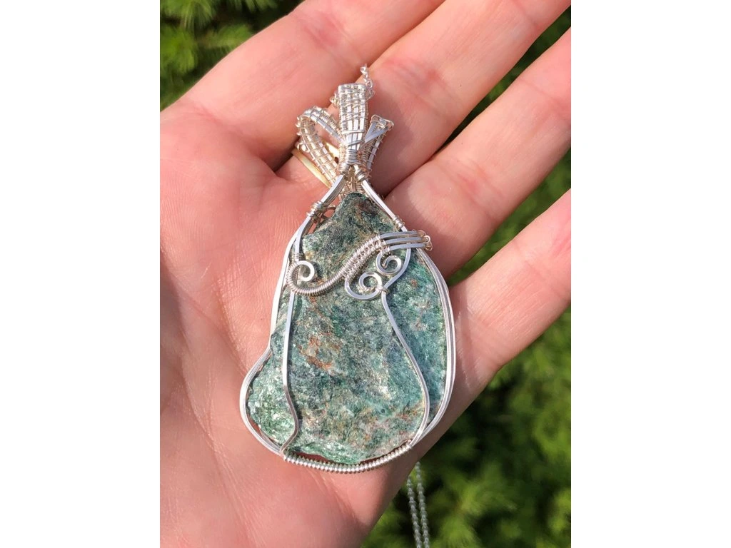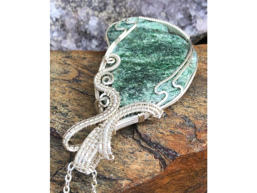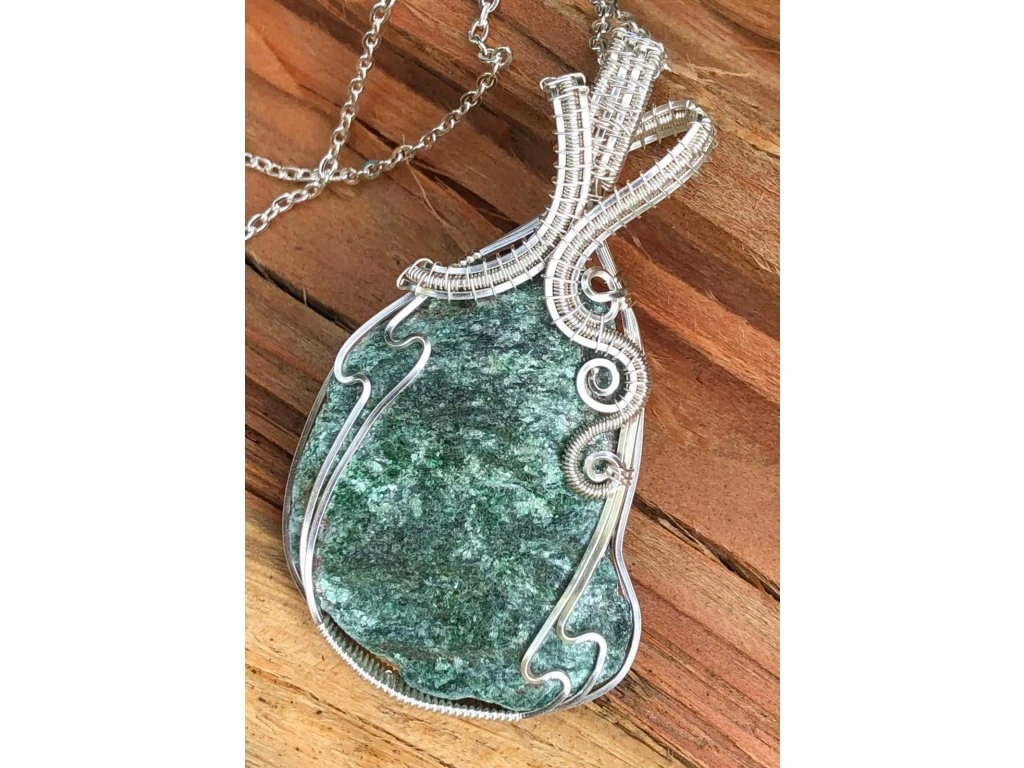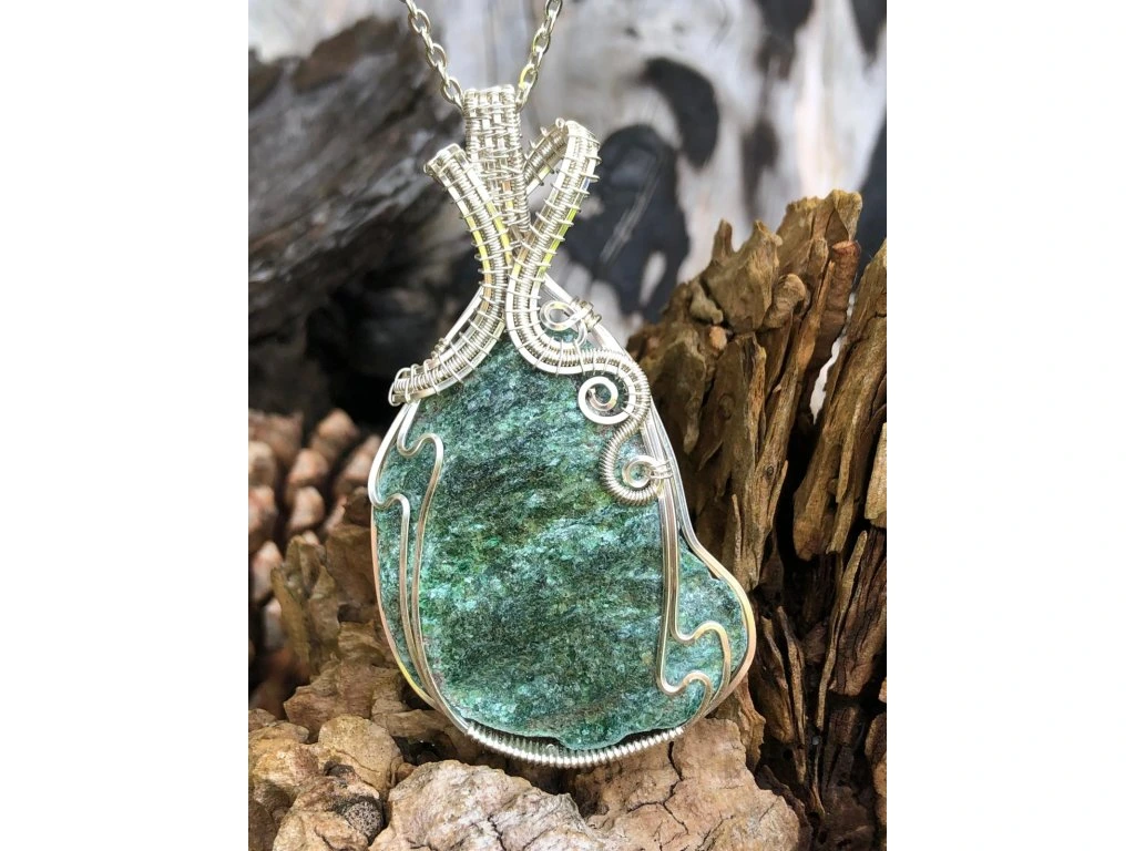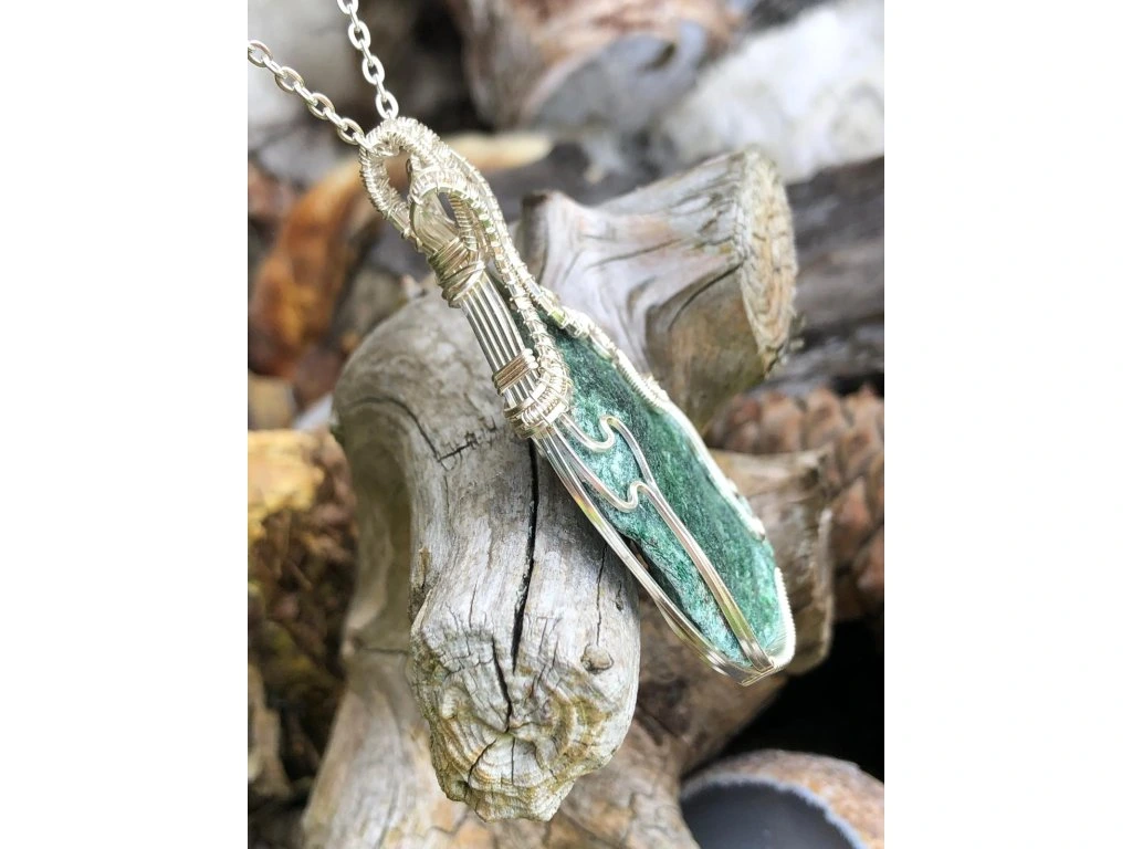 Jedinečný surový minerál fuchsitu, který je pečlivě zasazený do náhrdelníku. Použité drátky jsou z lakované mědi ve stříbrné barvě.
