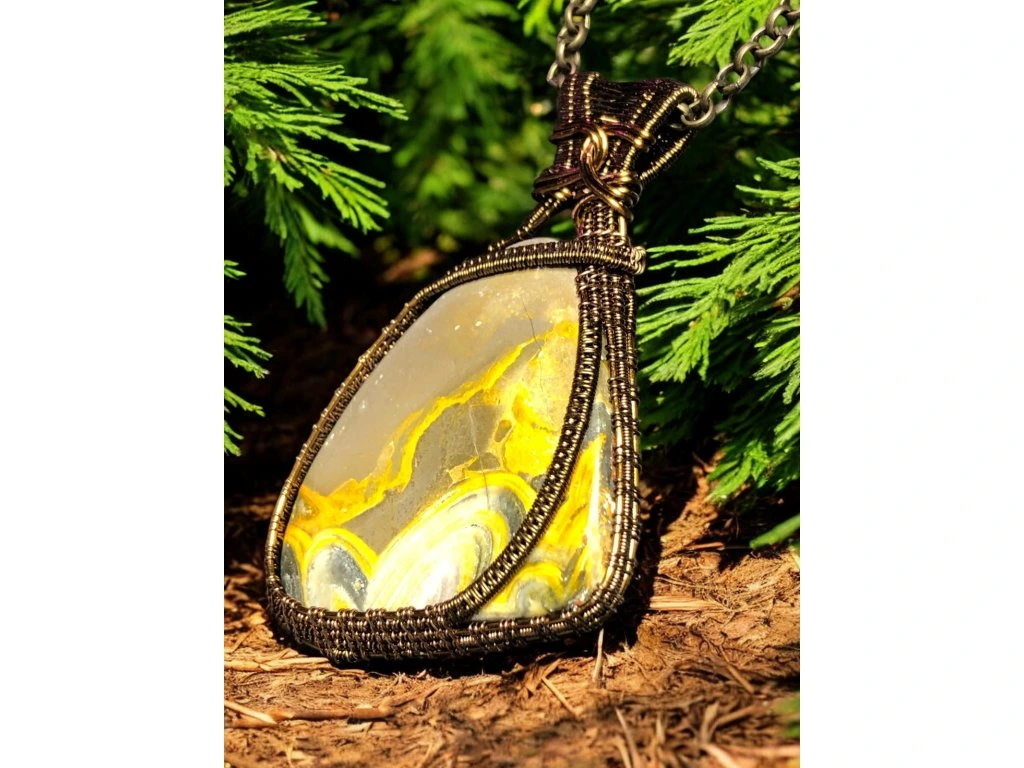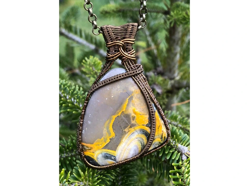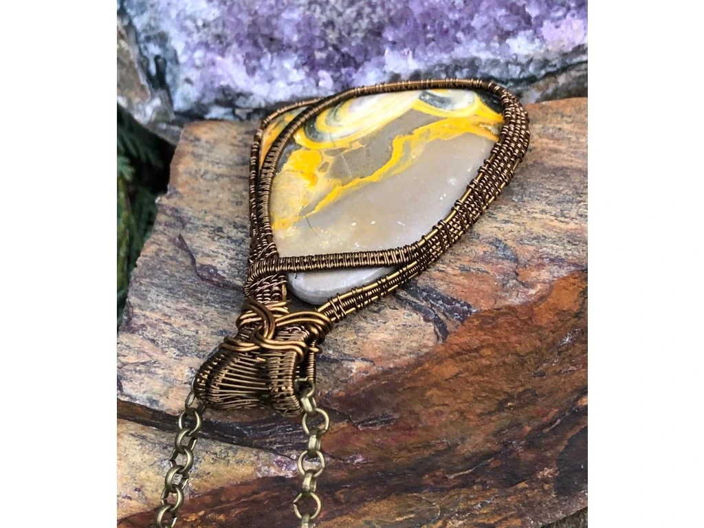 ČMELÁČÍ JASPIS (ang. Bumblebee jasper) pojmenovaný podle čmeláka, jehož svým zbarvením připomíná, je na Západním trhu poměrně novinkou. Nejedná se o klasický jaspis, jak by z názvu bylo patrné, ale o sloučeninu hematitu, tygřího oka a síry. Těží se v Indii v oblastech sirných dolů a aktivních sopek. Místní ho proto označují jako sopečný jaspis. Je výborným kamenem pro pozitivní myšlení a sebedůvěru. Je vhodným kamenem pro sakrální a solar plexus čakru.