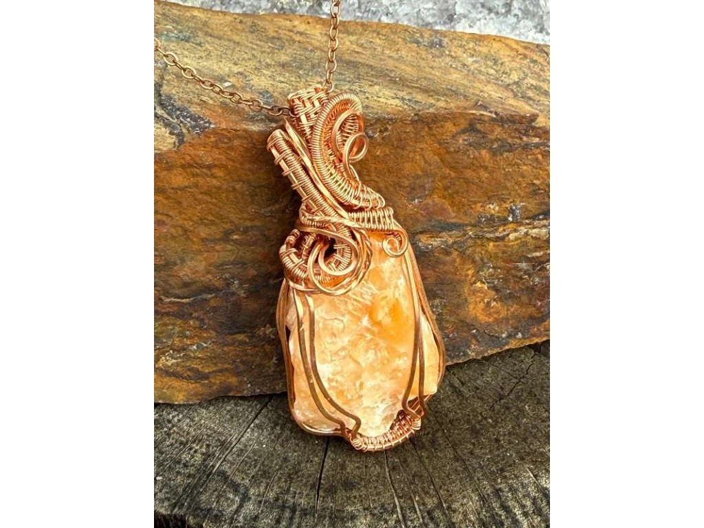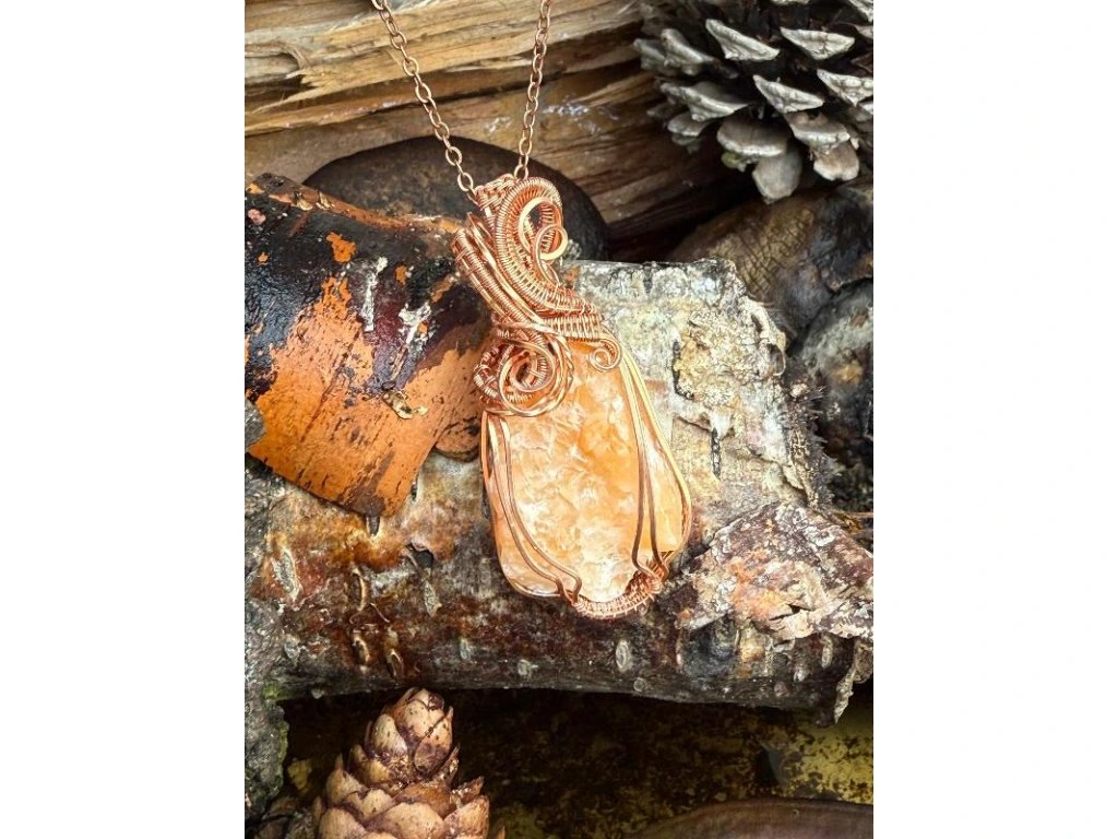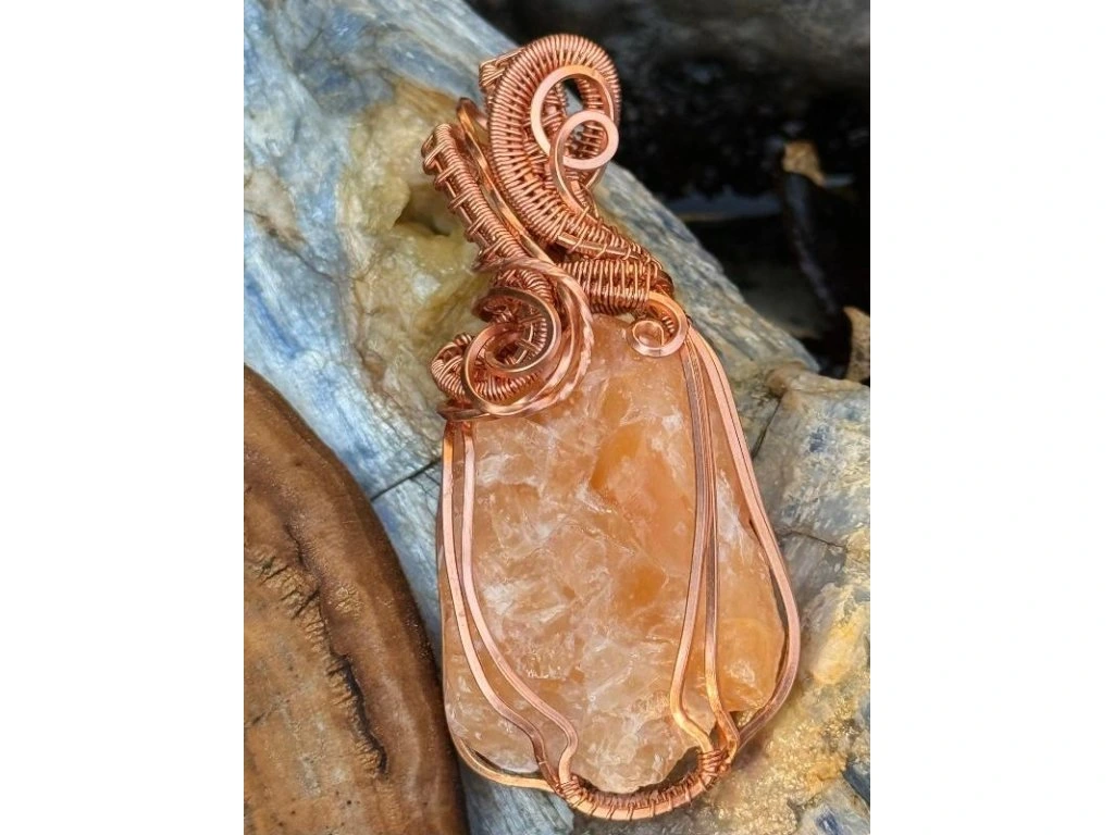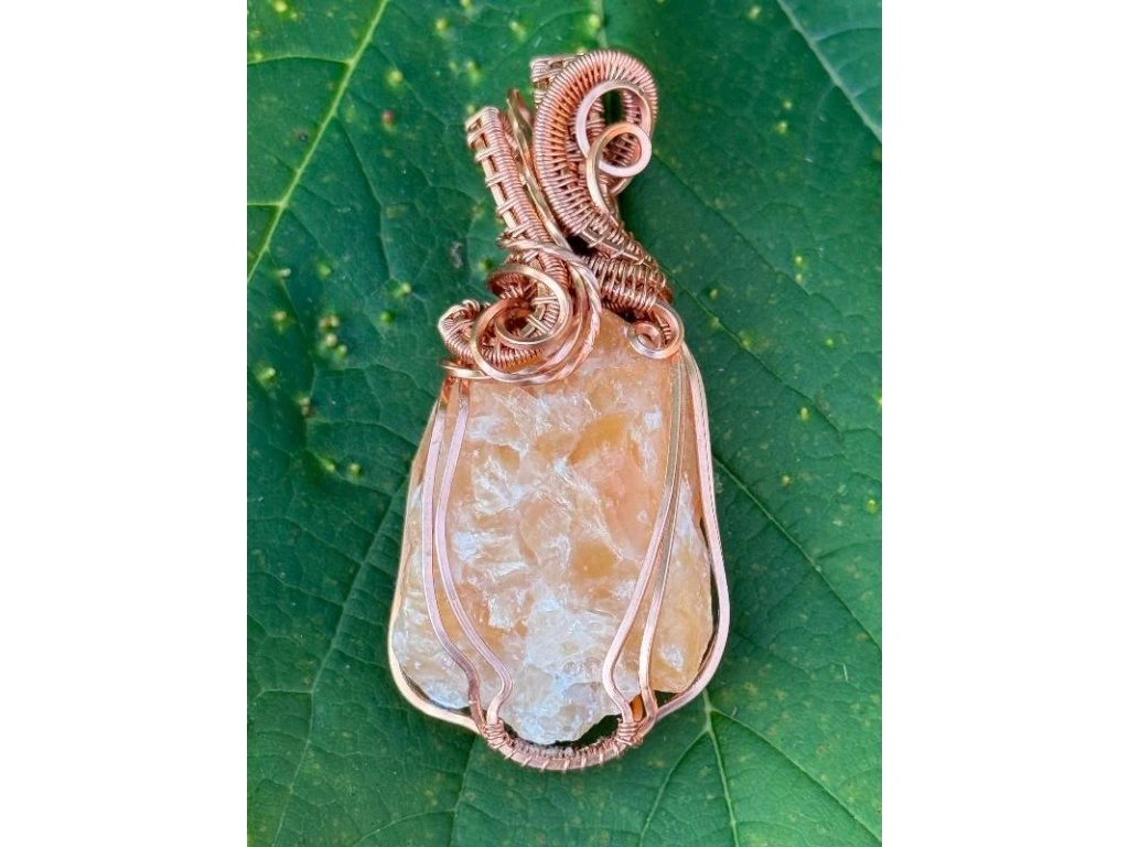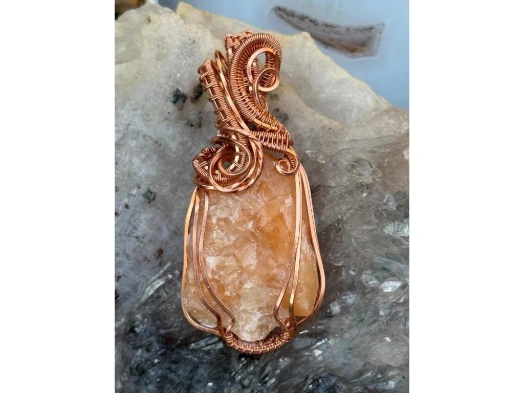 Na tento šperk je použitý nádherný surový kalcit o rozměrech 3,4 × 2,41 cm. Použité drátky jsou měděné.