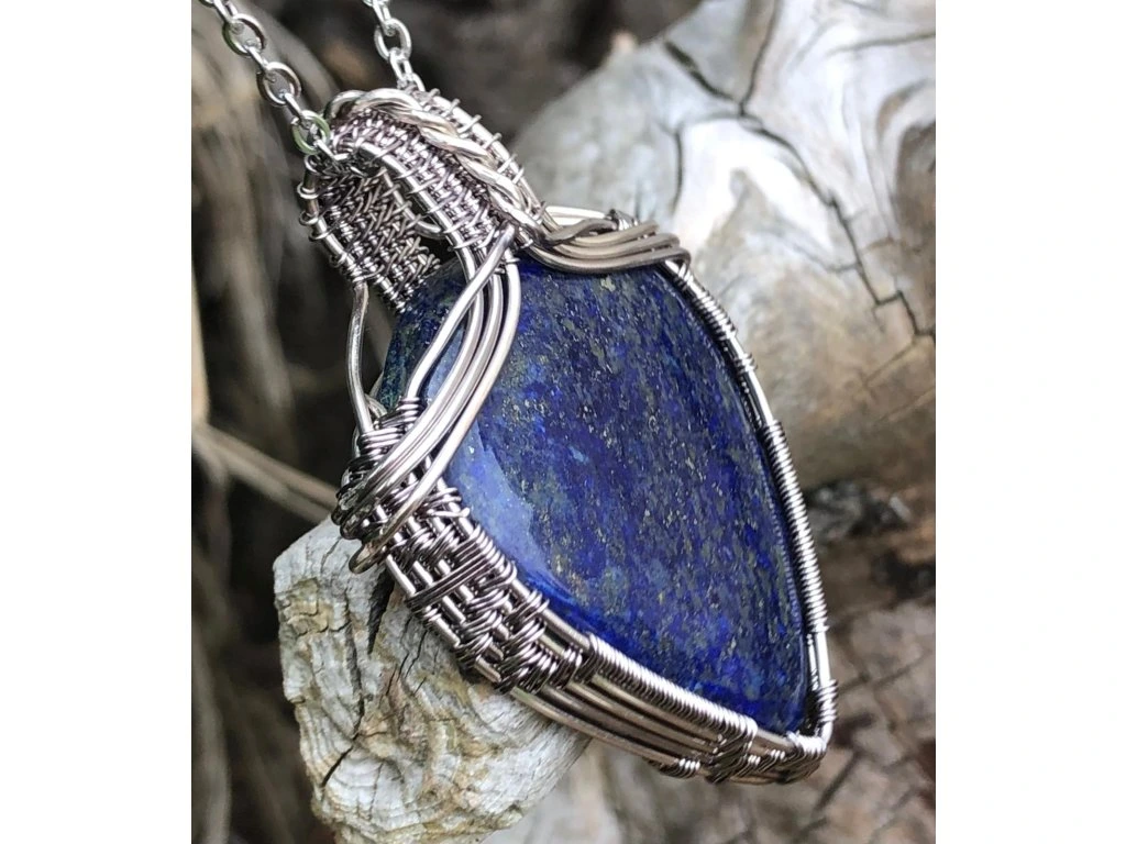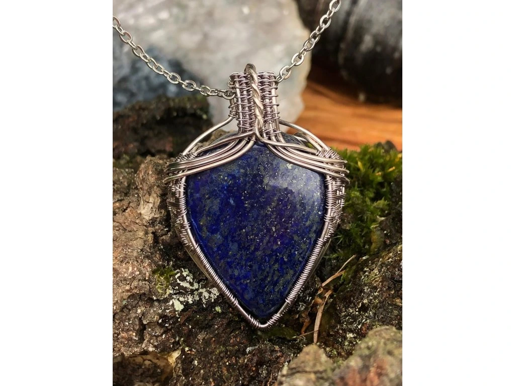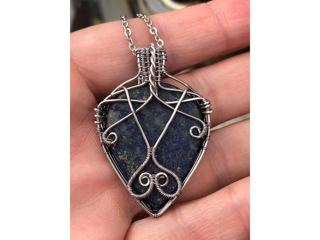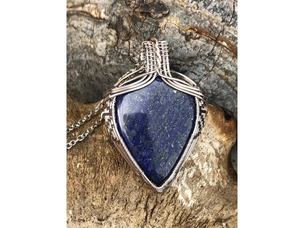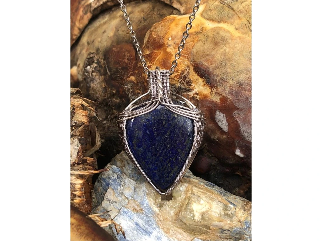 Na tento náhrdelník s lapisem lazuli byl použit kabošon ve tvaru slzy o rozměrech 3,4 × 2,6 cm. Použité drátky jsou z lakované mědi v titanové barvě.