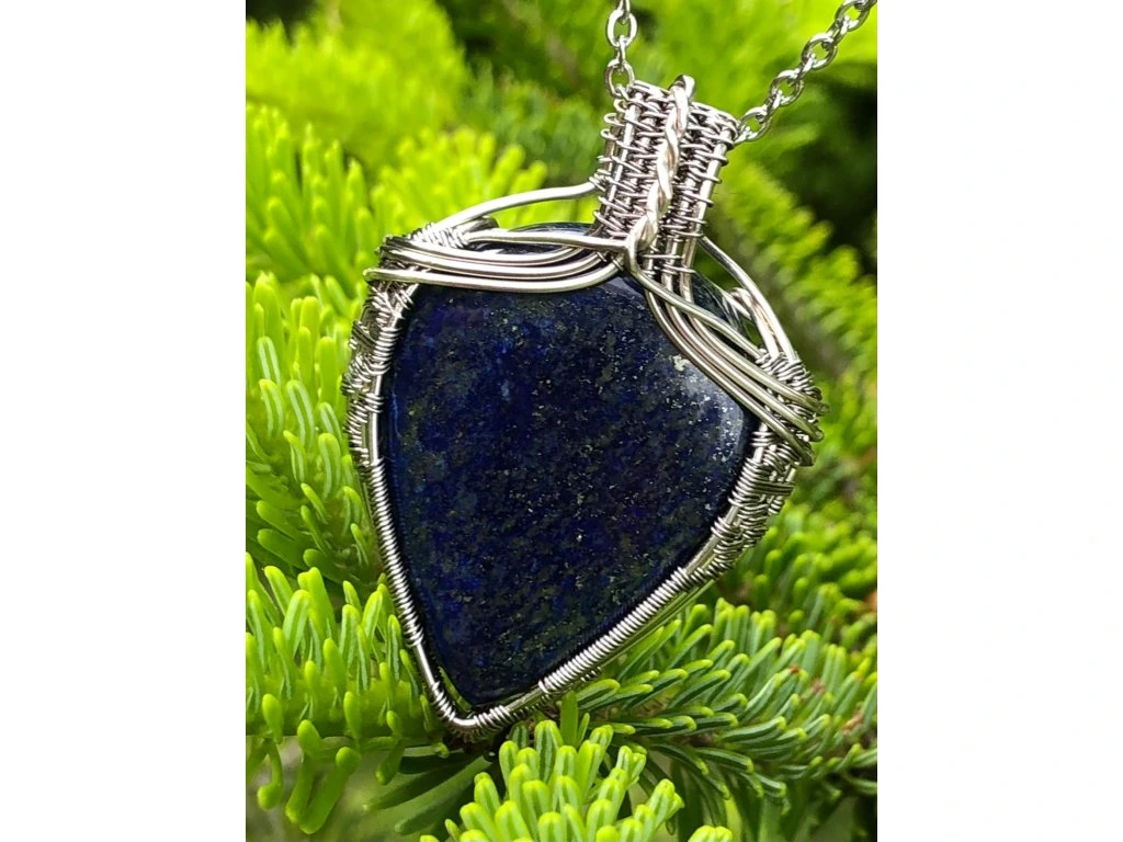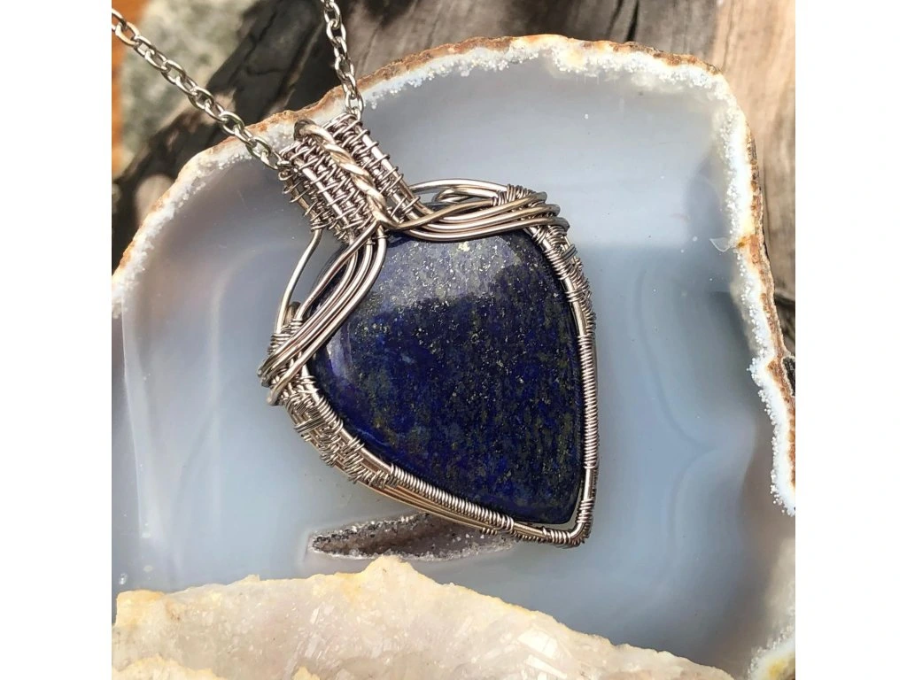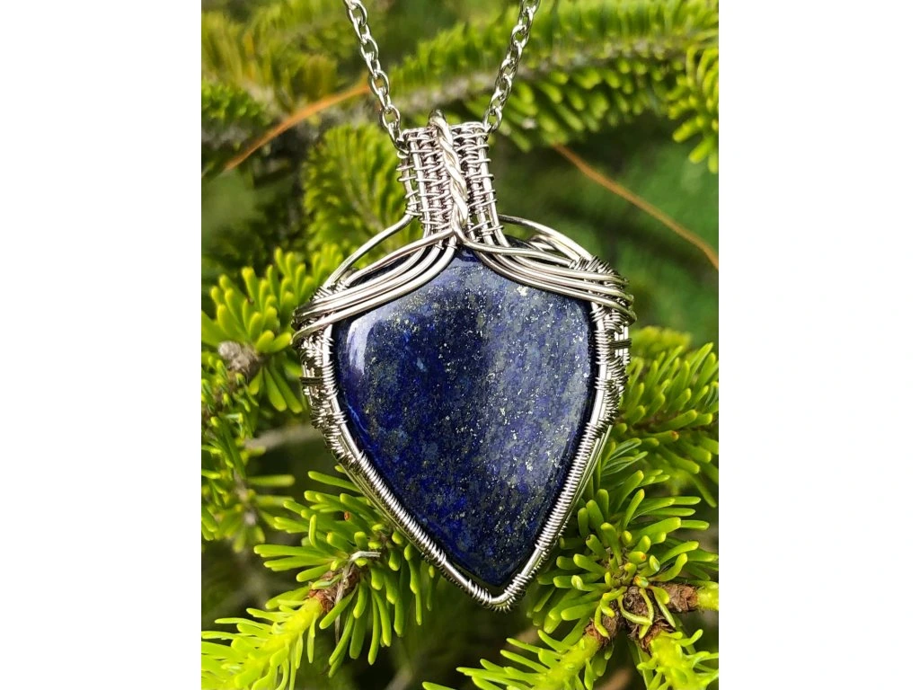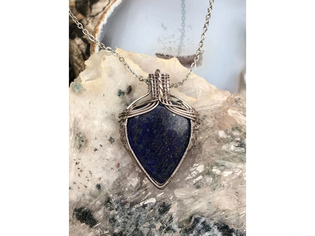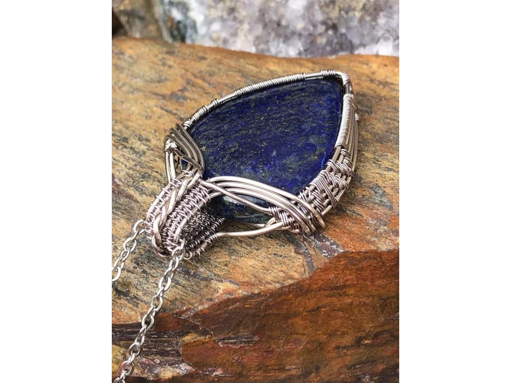 Na tento náhrdelník s lapisem lazuli byl použit kabošon ve tvaru slzy o rozměrech 3,4 × 2,6 cm. Použité drátky jsou z lakované mědi v titanové barvě.