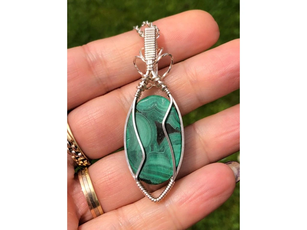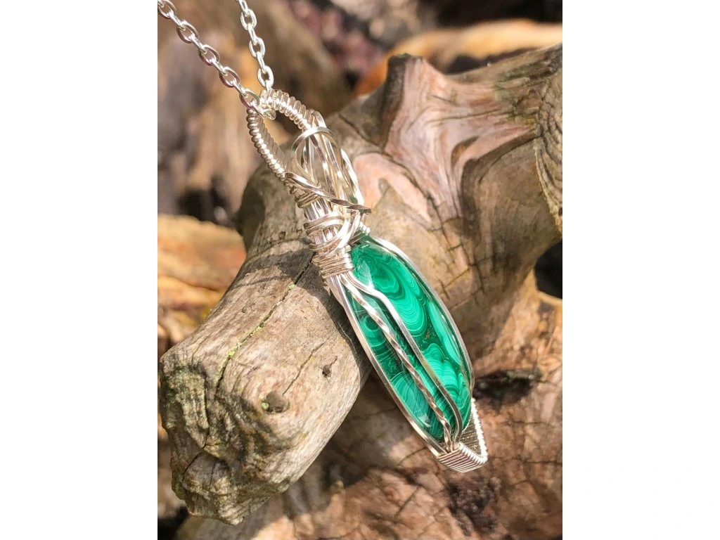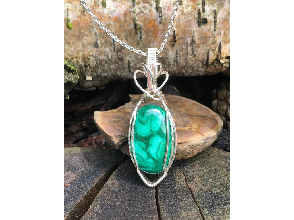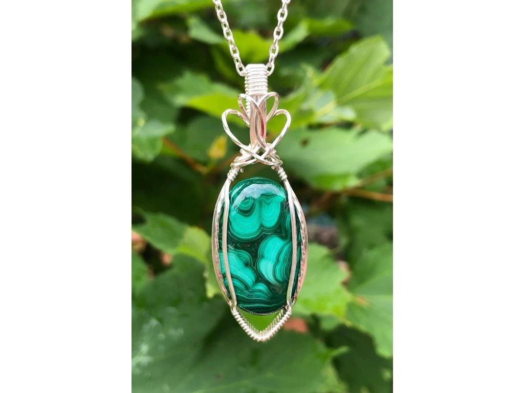 Jednoduchá vazba tohoto šperku s malachitem dává vyniknout minerálu s krásnou kresbou o rozměrech 2,9 × 1,8 cm. Použité drátky jsou z lakované mědi ve stříbrné barvě.