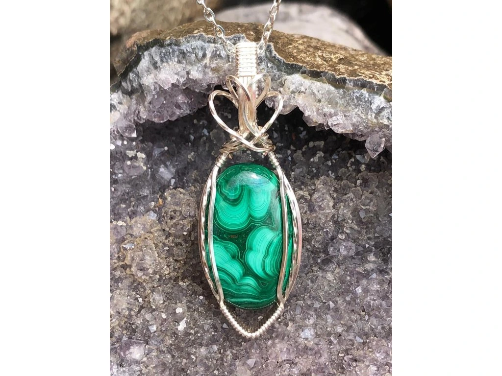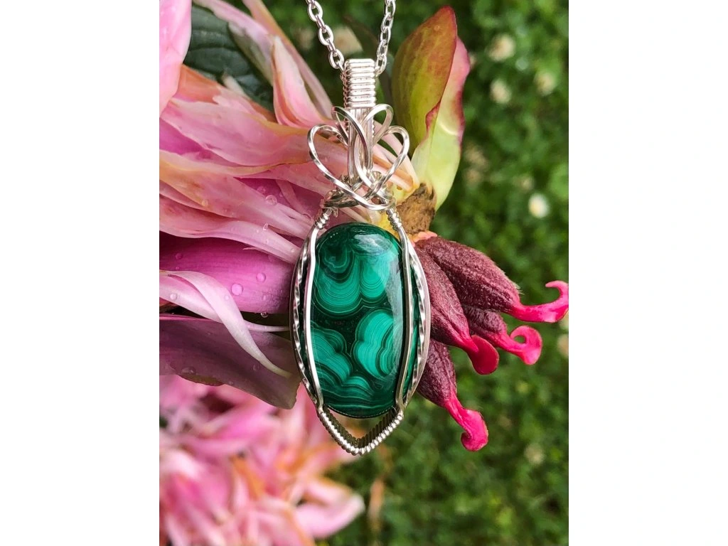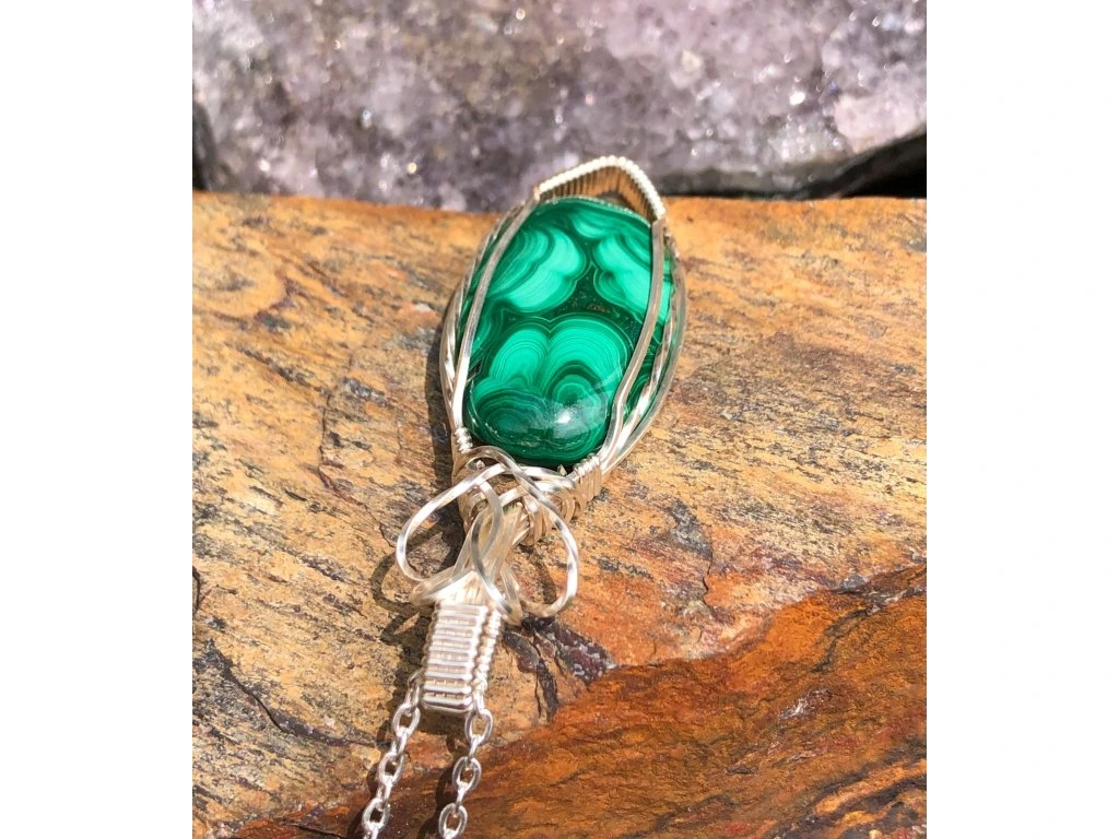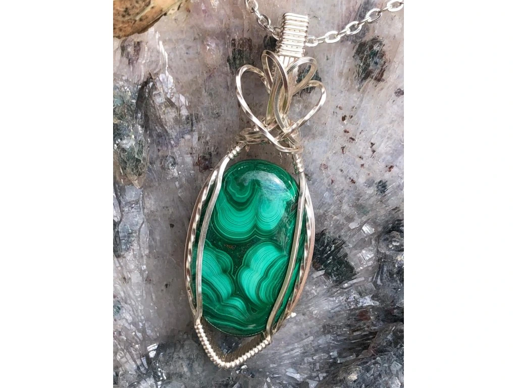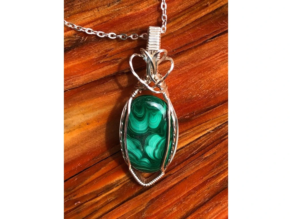 Jednoduchá vazba tohoto šperku s malachitem dává vyniknout minerálu s krásnou kresbou o rozměrech 2,9 × 1,8 cm. Použité drátky jsou z lakované mědi ve stříbrné barvě.
