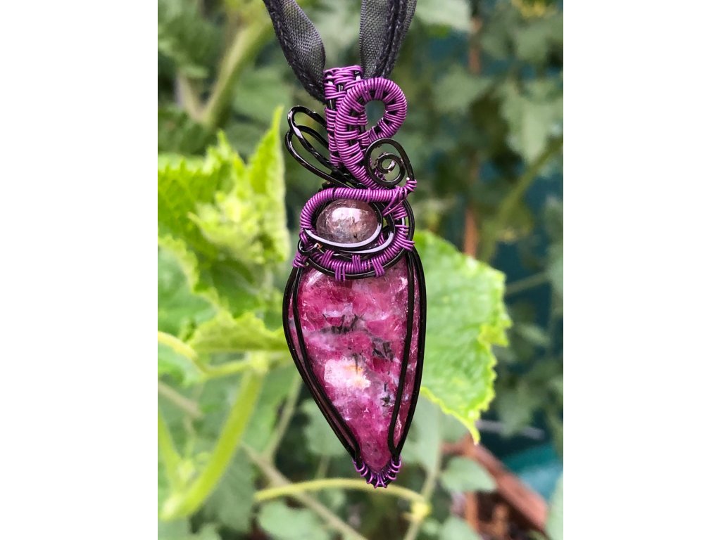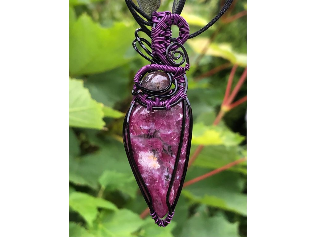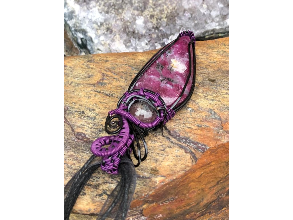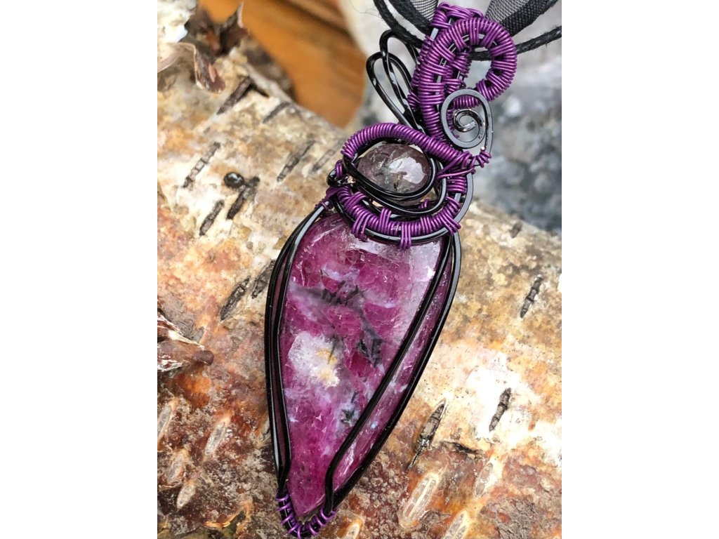 Nádherný kabošon rubínu ve tvaru slzy o velikosti 3,86 × 1,96 cm zdobí tento šperk. Použité drátky jsou z lakované mědi v černé a fialové barvě.