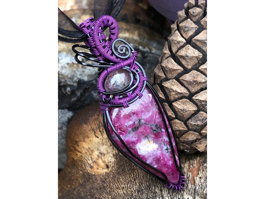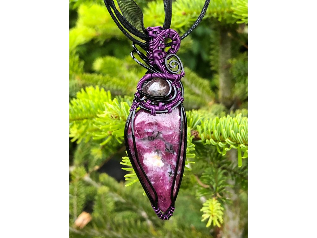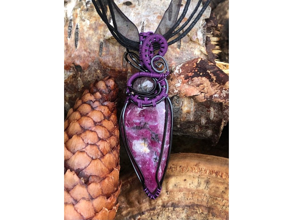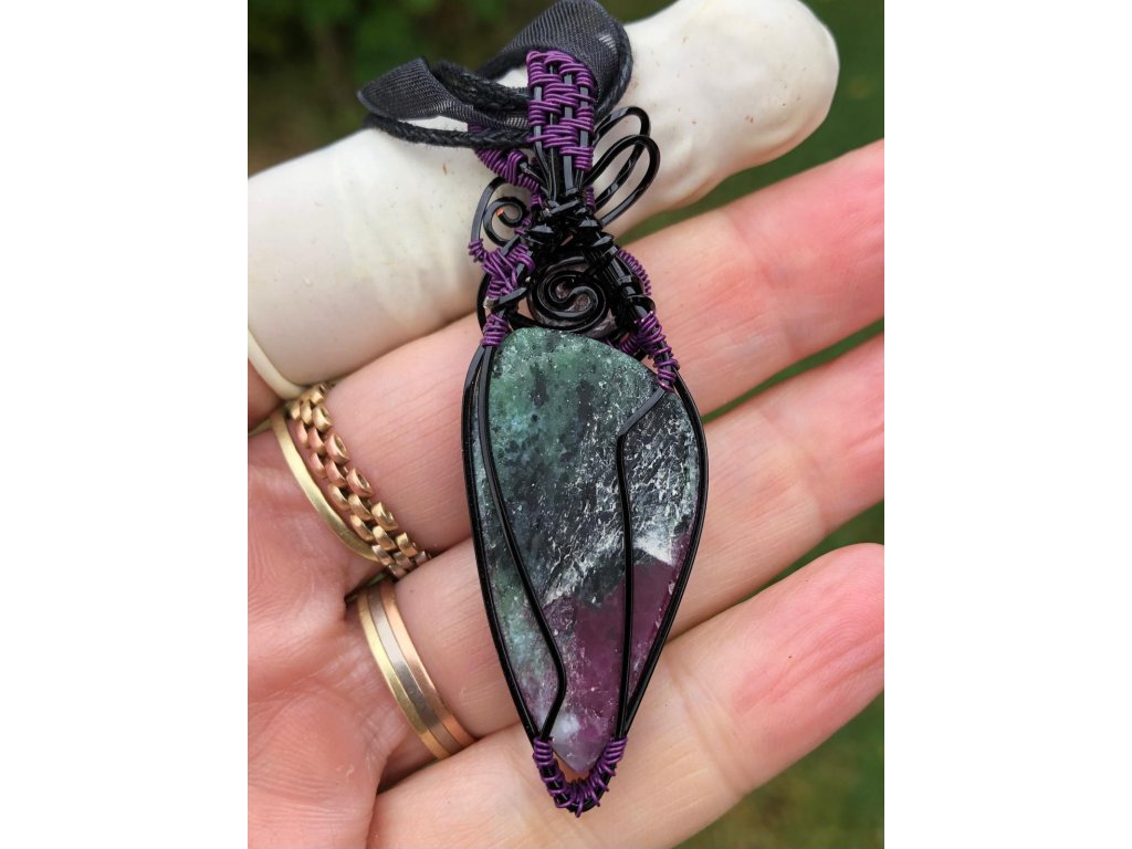 Nádherný kabošon rubínu ve tvaru slzy o velikosti 3,86 × 1,96 cm zdobí tento šperk. Použité drátky jsou z lakované mědi v černé a fialové barvě.