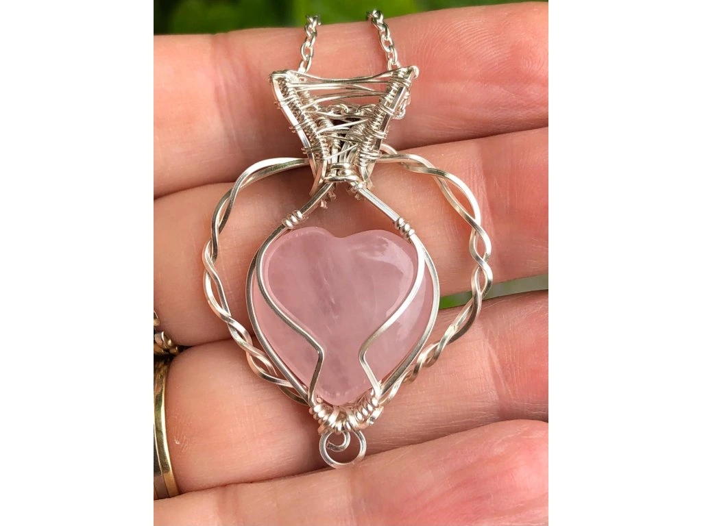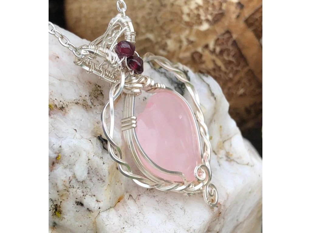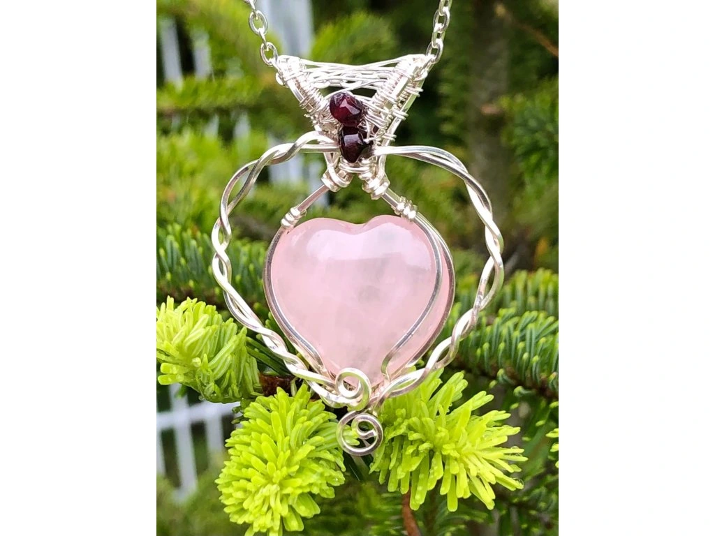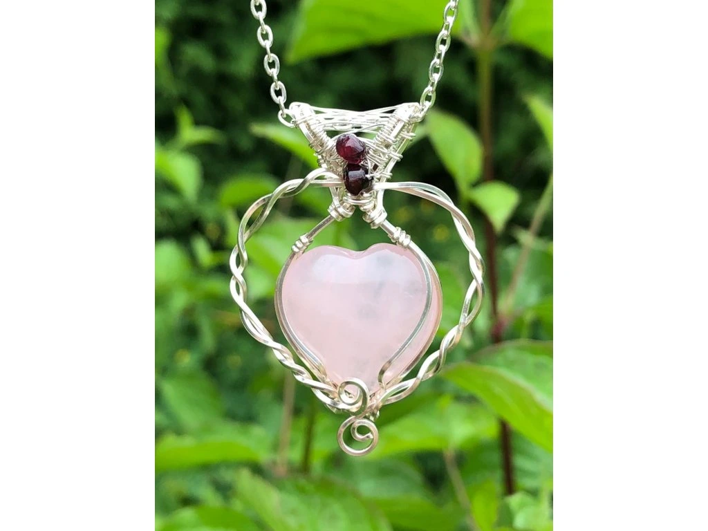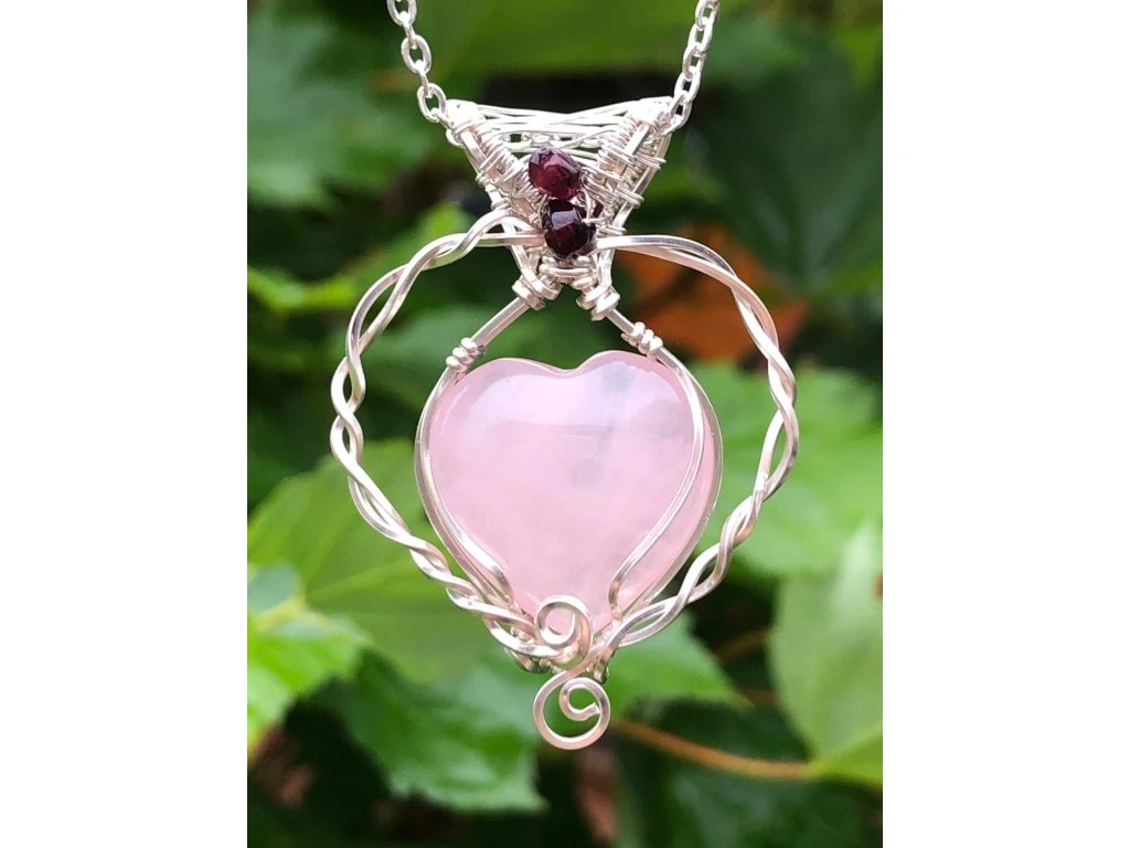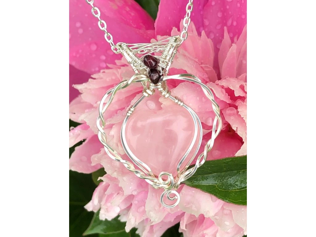 Tento náhrdelník s růženínem a granáty zdobí kabošon ve tvaru srdce o rozměrech 1,99 × 2,02 cm a malé granáty v závěsu. Použité drátky jsou z lakované mědi ve stříbrné barvě.