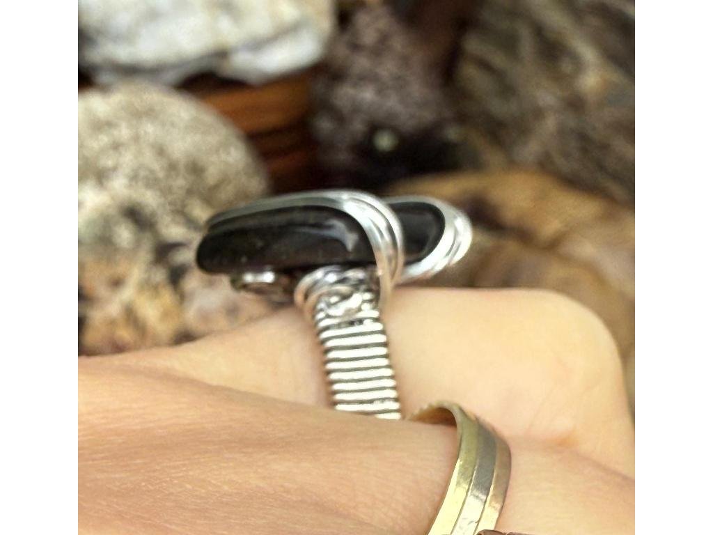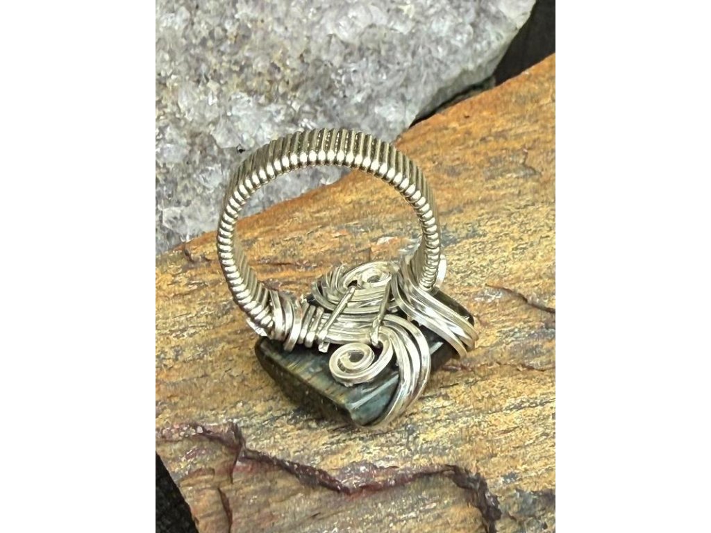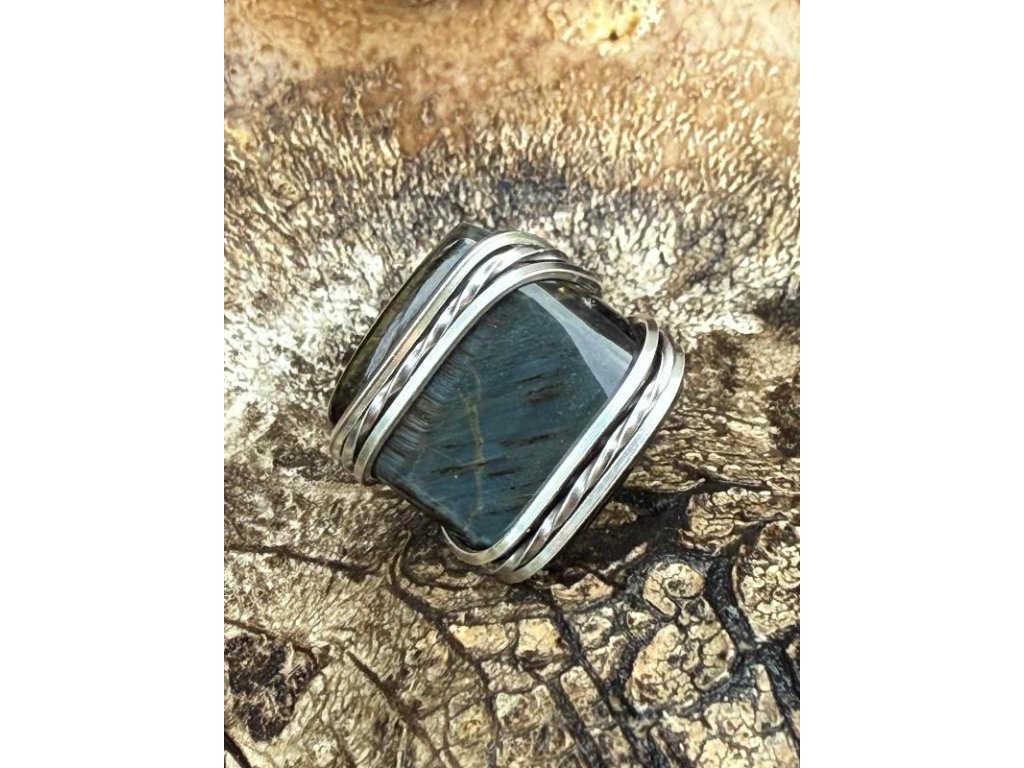 V tomto prstenu je použitý kámen ve tvaru čtverce o velikosti 1,71 × 1,63 cm. Použité drátky jsou z lakované mědi v titanové barvě.