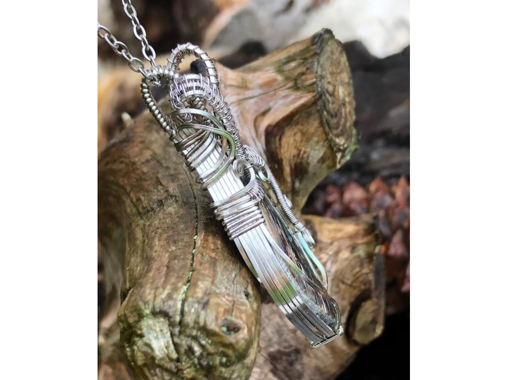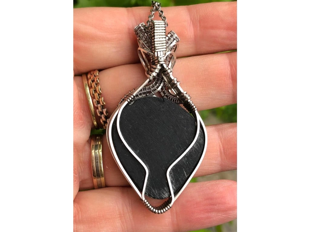 Opět jeden z netradičních tvarů o velikosti 3,3 x 2,8 cm je použitý v tomto šperku. Vazba v horní části je vyplétaná. Použité drátky jsou lakovaná měď v barvě titanu.